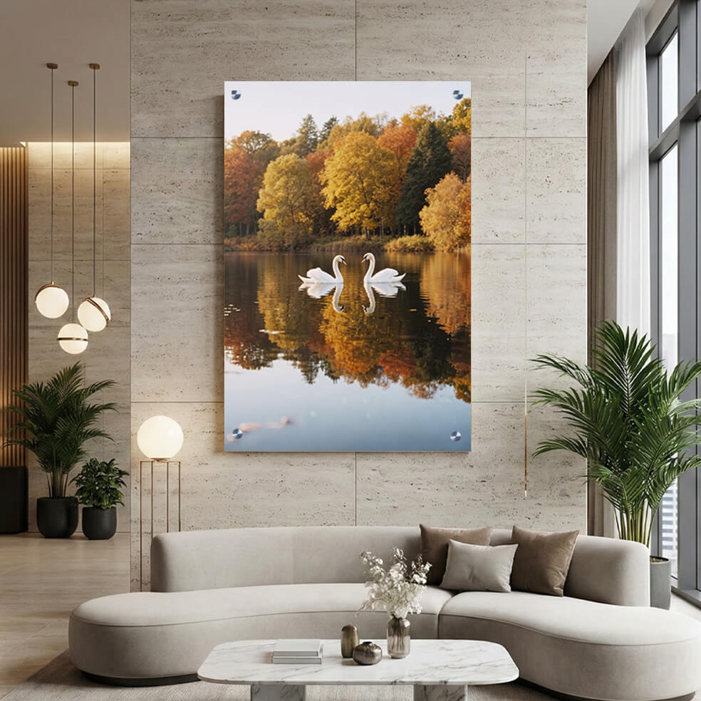 התמונה על זכוכית מציגה זוג ברבורים לבנים השוחים על אגם שקט והשתקפות יערות סתיו בגוונים עשירים של צהוב וכתום. הדפסה על זכוכית זו נותנת חיים לתמונת נוף קסומה שמחברת בין טבע ופסטורליה באווירה שלווה ומלאת צבע. תמונת זכוכית זו מהווה בחירה מושלמת לתמונות זכוכית לסלון, המדגימות ניגודיות נעימה בין הלובן הזוהר של הברבורים לבין גווני החרדל השופעים של עלי הסתיו. במבנה מלבני לאורך, תמונת זכוכית משלבת קומפוזיציה אסתטית שמדגישה את הדינמיות של המים וההשתקפות, ועשויה להעצים את יופיו של כל חלל עם נגיעת אמנות וטבע עדינה.
