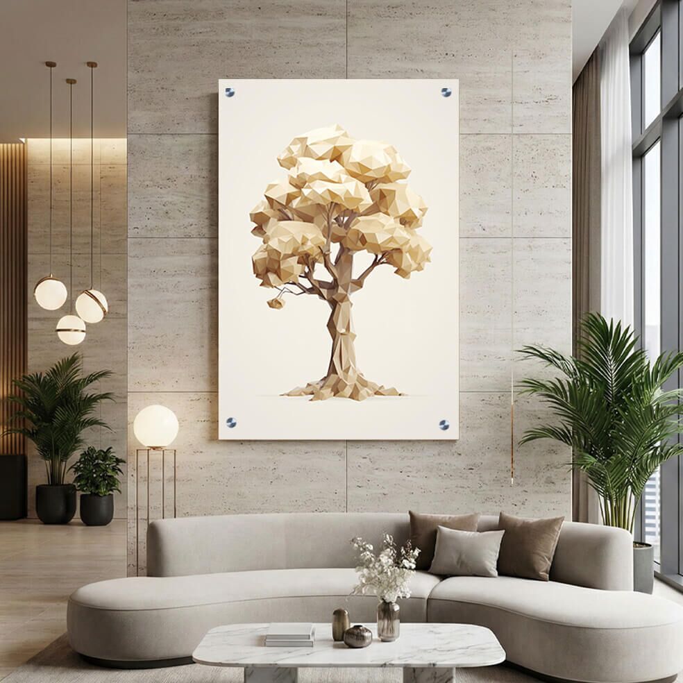 תמונת זכוכית מרהיבה המדגימה עץ גיאומטרי תלת-ממדי בסגנון פולי-גון נמוך, בגוונים שנהב-זהב עדינים על רקע בהיר. ההרכב המלבני לאורך מדגיש את הייחודיות של העיצוב המודרני והאלגנטי, היוצר תחושה של עומק ומורכבות ויזואלית. ההדפסה על זכוכית מציעה מראה נוצץ, שמבליט כל פרט ומעניק לתמונה מימד ייחודי ורענן. תמונות זכוכית אלו מתאימות באופן מושלם כתמונות זכוכית לסלון ומאפשרות להוסיף נופך של אמנות מודרנית ותחכום בעיצוב הבית. תמונה על זכוכית באיכות גבוהה מבטיחה עמידות לאורך זמן ושימור הצבעים, מה שהופך אותה לבחירה אידיאלית למי שמחפש פנינה דקורטיבית מכל הבחינות.
