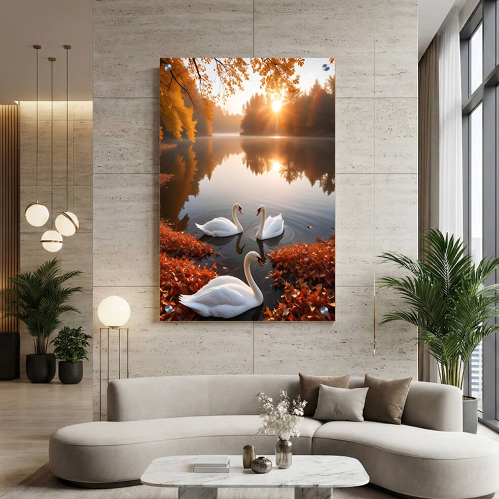 תמונת זכוכית זו מציגה שלושה ברבורים לבנים אלגנטיים השוחים על אגם שקט, מוקף בעצי סתיו בשלל גוונים חמים של כתום וחום, עם שמש עולה המוסיפה זוהר רך וקסום. ההרמוניה שבין הטבע השקט והתעוררות היום מתבטאת בהדפסה על זכוכית איכותית, היוצרת עומק ומדגישה כל פרט בקומפוזיציה. תמונת זכוכית זו מתאימה במיוחד כסמל של טבע ושלווה, ומעניקה אווירה חמה ונעימה. עם תמונות זכוכית לסלון מסוג זה, תוכלו להוסיף מימד של חלום ויופי אורבני שקט לחללכם. תמונה על זכוכית איכותית זו תבליט את היופי הטבעי של הברבורים והאגם, ותחמם כל חדר בסגנון הקלאסי והטבעי.
