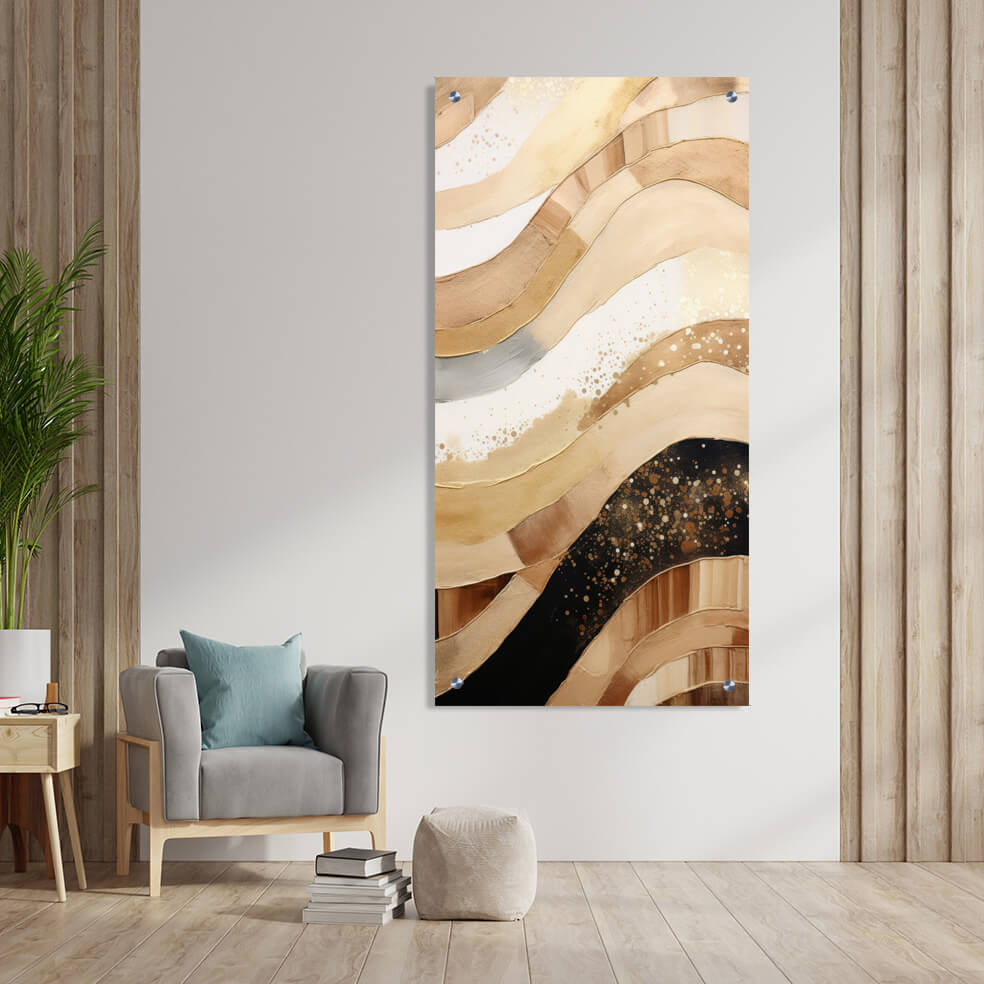 גלשו לתוך עולם של קומפוזיציה אבסטרקטית עטופה בגלים אופקיים מדורגים בגוונים מרהיבים של זהב, בז' ושחור, שמוסיפים ניצוצות זהב שמפזרים אור וחיים לתמונה. הדפסה על זכוכית יוצרת מראה מודרני ועשיר, המאפשר לתמונת זכוכית זו לבלוט ולהשפיע באופן ייחודי על האווירה. תמונות זכוכית אלו מעניקות לסלון נופך של אלגנטיות ופשטות כאחד, ויוצרות פוקוס ייחודי עם קומפוזיציה פנורמית לאורך, המוסיפה תחושת עומק ורוחב. תמונה על זכוכית זו משלבת צבעוניות חמה עם עיצוב עדין, ומבטיחה להוות פריט מרכזי ומשלים לכל עיצוב פנים מודרני או קלאסי. תמונות זכוכית לסלון הן הבחירה המושלמת להעצמת החלל בעזרת אמנות בסטייל מופשט ואלגנטי.