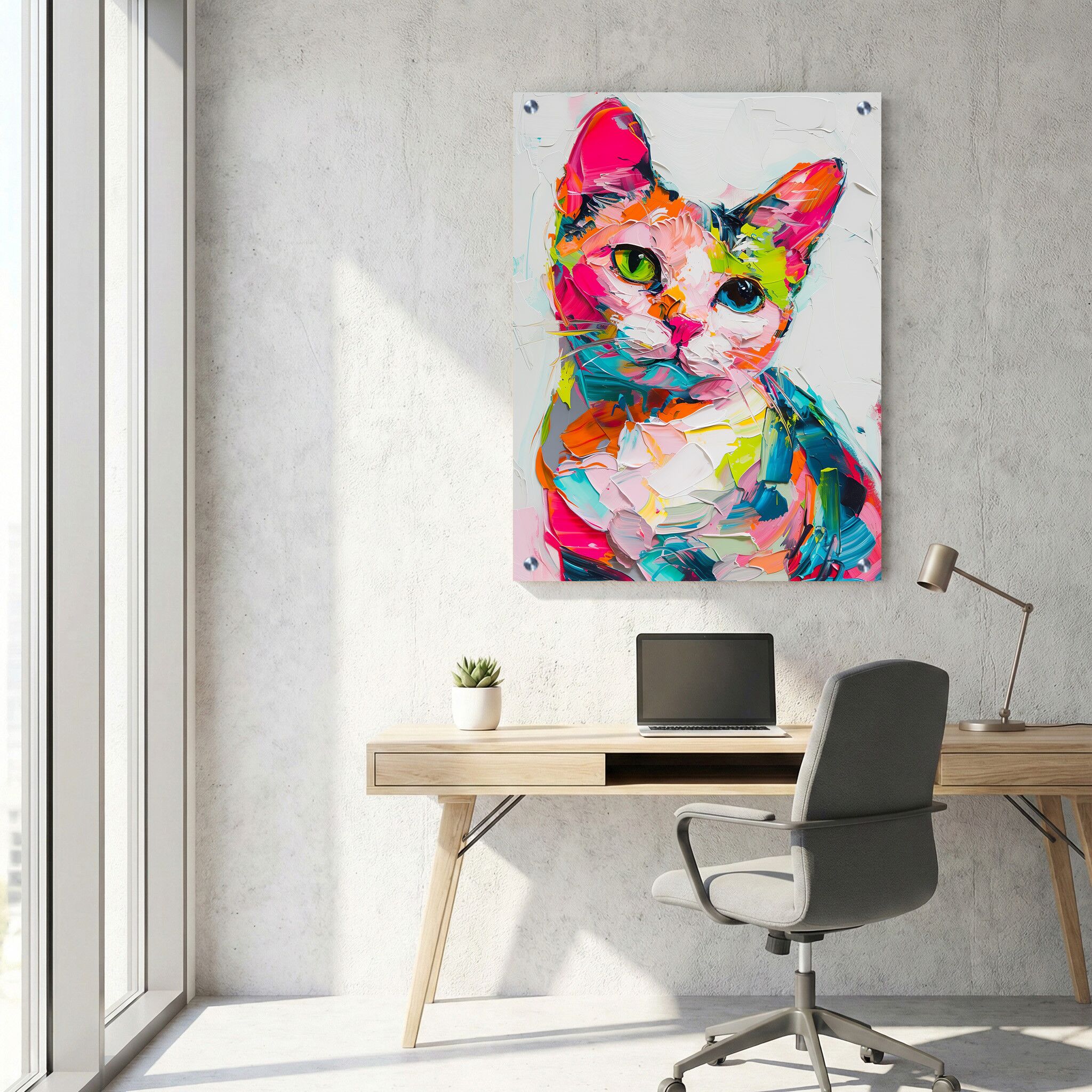 תמונה על זכוכית בצורת הדפסה על זכוכית המתארת חתול צבעוני בסגנון ציור שמן, עם צבעים עזים ומרקם עבה שמדגיש כל מברשת וצבע. התמונה מלבנית לאורך, ומעבירה אווירה אומנותית וחזקה שמתאימה כחלק מקולקציית תמונות זכוכית למשרד. שילוב הצבעים המרהיב ותחושת העומק שנוצרה מהמרקם העבה מעניקים לתמונת זכוכית זו מראה ייחודי ומרהיב שמבליט כל חלל. תמונת זכוכית זו משדרגת את האווירה המקצועית והיצירתית של המשרד, ומשלבת אלמנטים של אומנות מודרנית בסגנון ציור שמן.