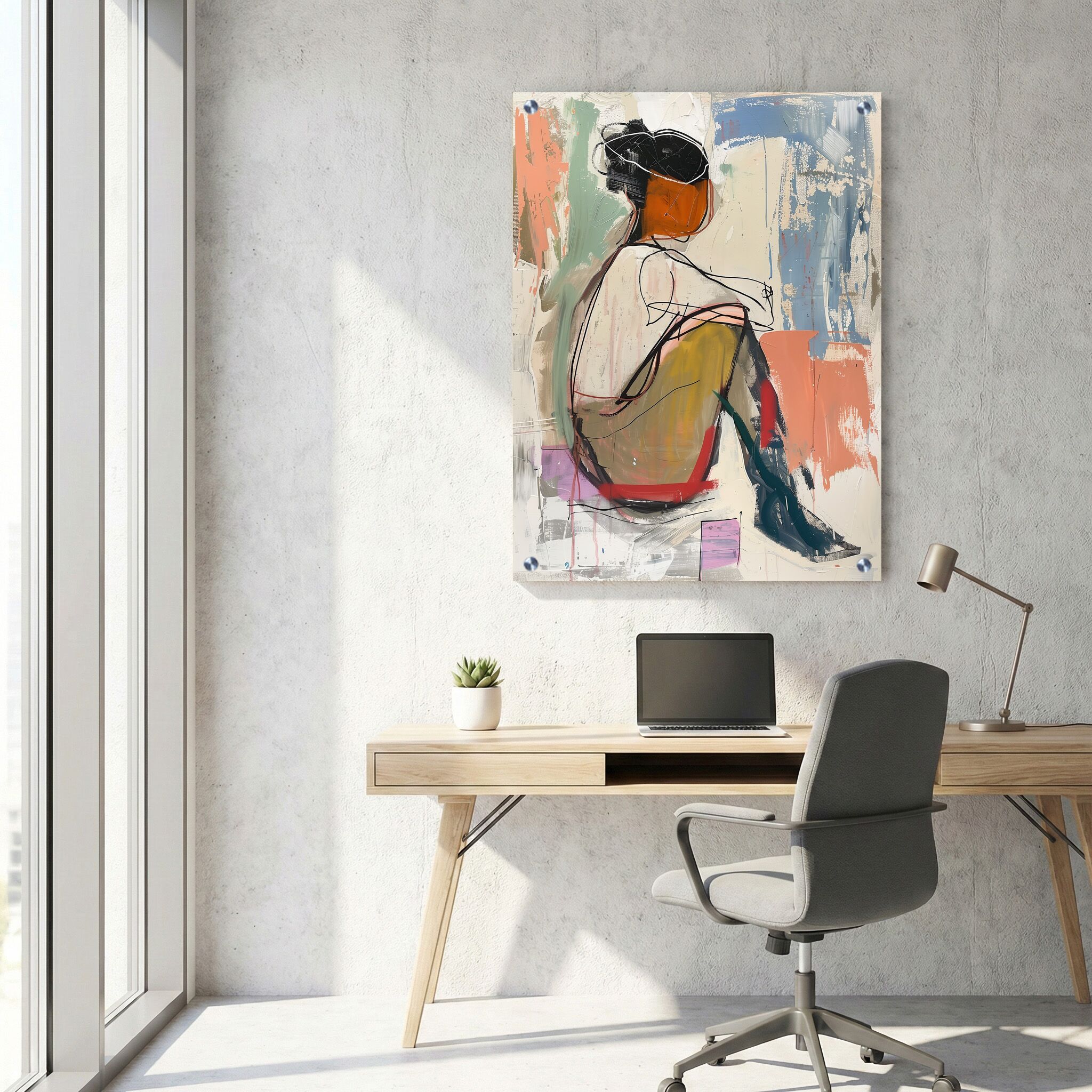 תמונה על זכוכית זו מציגה אישה יושבת במבט ממעוף הציפור על רקע מופשט בצבעי פסטל רכים, היוצרים אווירה עדינה ומרגיעה. ההדפסה על זכוכית מדגישה את הצבעים החלקים והקומפוזיציה המלבנית לאורך, שהופכת אותה לבחירה אידיאלית לתמונות זכוכית למשרד המעניקות נופך אמנותי ועכשווי. תמונת זכוכית זו משלבת אלמנטים של תמונות אבסטרקט ושימוש עדין בגווני פסטל, תוך שמירה על תחושת רוגע והרמוניה במרחב.
