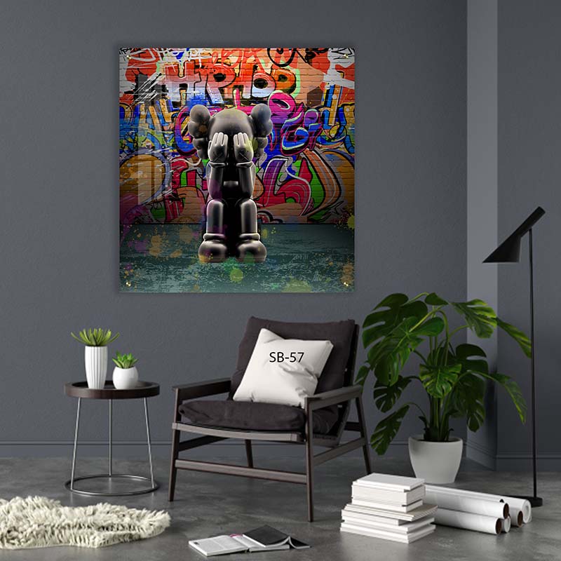 תמונת זכוכית זו מציגה דמות בובה שחורה יושבת, המכסה את פניה בסגנון פופ ארט ייחודי, המונחת על רקע גרפיטי צבעוני וקיר לבנים. השילוב המרהיב בין הצבעוניות של הגרפיטי לבין הבובה השחורה מדגיש את הניגוד והקונטרסט תוך יצירת קומפוזיציה שמושכת את העין. תמונות זכוכית לסלון בסגנון זה מביאות עיצוב מודרני וחי לנושא האמנות הפופולרית ומעניקות תחושה דינמית ומיוחדת שמעניקה עומק ועניין לכל חלל. ההדפסה על זכוכית מדויקת וברורה, והופכת כל תמונה על זכוכית לפסל אמנות מרהיב שמוסיף צבע וחיים לקיר הבית.
