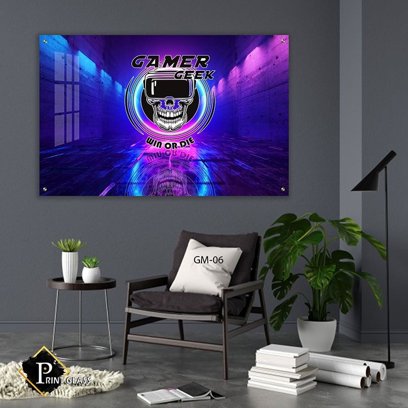 תמונה על זכוכית מעוצבת בצורה מלבנית לרוחב, המציגה גולגולת עם משקפי מציאות מדומה בצבעי ניאון סגול וכחול. ההדפסה על זכוכית יוצרת אפקט ויזואלי מואר ומודרני, המשלב בין אלמנטים תעשייתיים לסגנון עכשווי. תמונות זכוכית לחדר שינה אלו מביאות אווירה אומנותית נועזת וייחודית, המתאימות למי שמחפש להוסיף נגיעה של עיצוב חדשני וחלק. תמונת זכוכית זו מפורטת, עם קומפוזיציה שמדגישה את צבעי הניאון המזרחיים בצורה חדה וברורה, ומשדרגת את חלל חדר השינה בתמונות זכוכית איכותיות ומרהיבות.