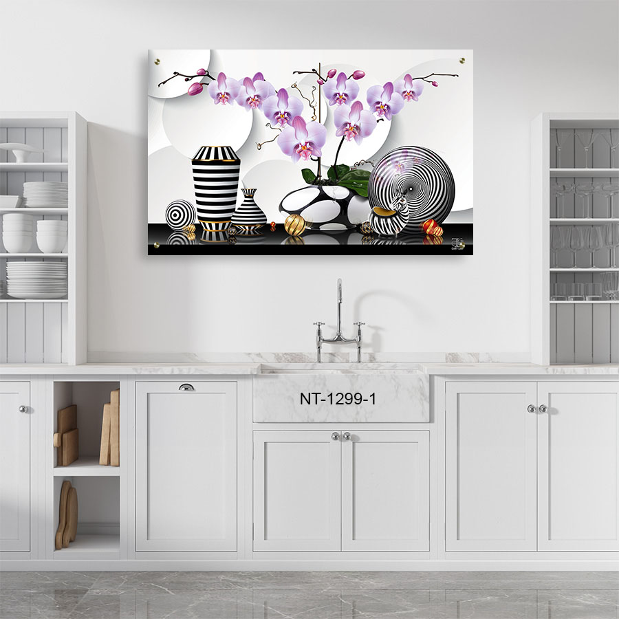 תמונת זכוכית למטבח – NT-1299-1. מציגה שילוב עוצר נשימה בין פרחים עדינים לבין עיצוב מודרני. במרכז היצירה מופיעים פרחי סחלב סגלגלים ורכים המשתלבים עם אגרטלים וכלי נוי בעיצוב פסים שחור לבן. לצדם אלמנטים דקורטיביים עגולים בצבעי זהב וכתום שמוסיפים ברק ואיזון. השילוב בין פרחים חיים לבין צורות גיאומטריות יוצר תמונה מזכוכית ייחודית שמוסיפה חום ואופי לכל מטבח.