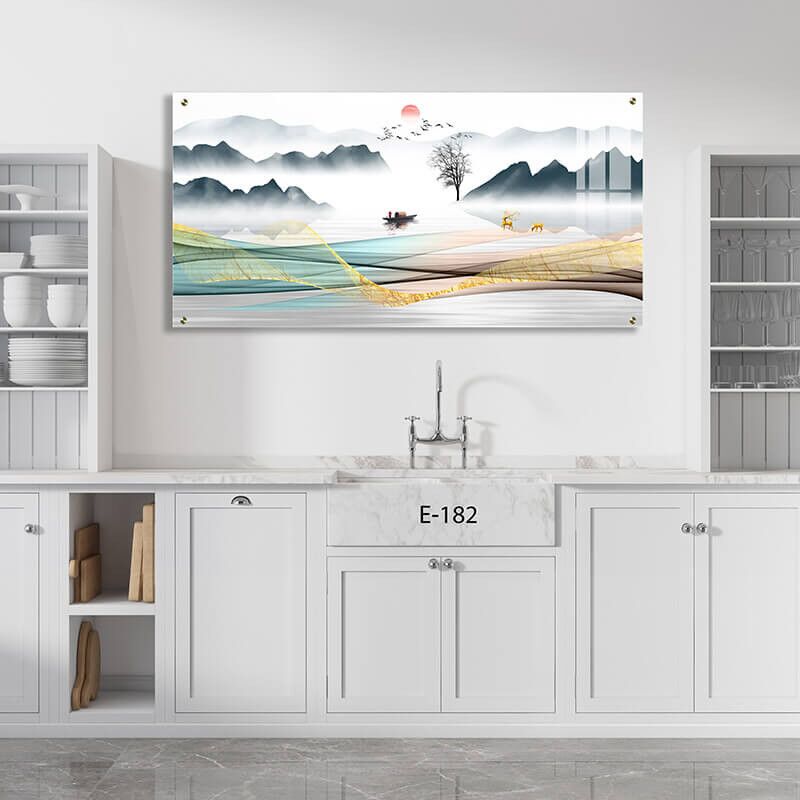 הדפסה על זכוכית זו מציגה תמונת זכוכית פנורמית ברוחב המתארת נוף מרהיב של הרים לצד סירה וגלים צבעוניים, המאפשרים חיבור טבעי ושליו. בתמונה מופיעים איילים , שמש זורחת ורוח ים קלילה, המסמלים שלווה ותחושת חופש. תמונות זכוכית למטבח מסוג זה מהוות ביטוי אמנותי אלגנטי ואווירה נעימה, שמשלבת אלמנטים של טבע והרים עם צבעוניות ססגונית ומרהיבת עין. תמונה על זכוכית זו ידגישה בכל מטבח את הקסם והחיות של הנוף הייחודי, ותשדר אופי ייחודי ותחושת שלווה באמצעות שילוב האובייקטים והצבעים השונים.