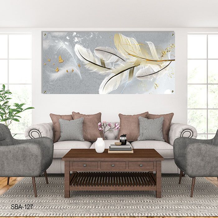 תמונת זכוכית לסלון SBA-127 מציגה הדפסה על זכוכית של נוצות לבנות גדולות המעוטרות בעיטורי זהב נוצצים, המשלבים פרפרים עדינים ופסטורליים על רקע אפור מופשט. הקומפוזיציה הפנורמית לרוחב יוצרת אווירה של רכות ואלגנטיות, ומדגישה את הדינמיות והעדינות שבאומנות. תמונות זכוכית לסלון מסוג זה מוסיפות מימד ייחודי וחדשני לקירות הבית, כשהן משלבות בין הקסם של הטבע לתשומת לב לפרטים דקורטיביים. תמונה על זכוכית זו משלבת מסורת וחדשנות, ויכולה לשמש כנקודת מוקד מעוררת השראה ומרגיעה, המתאימה לכל אוהבי העיצוב המודרני והקלאסי כאחד.