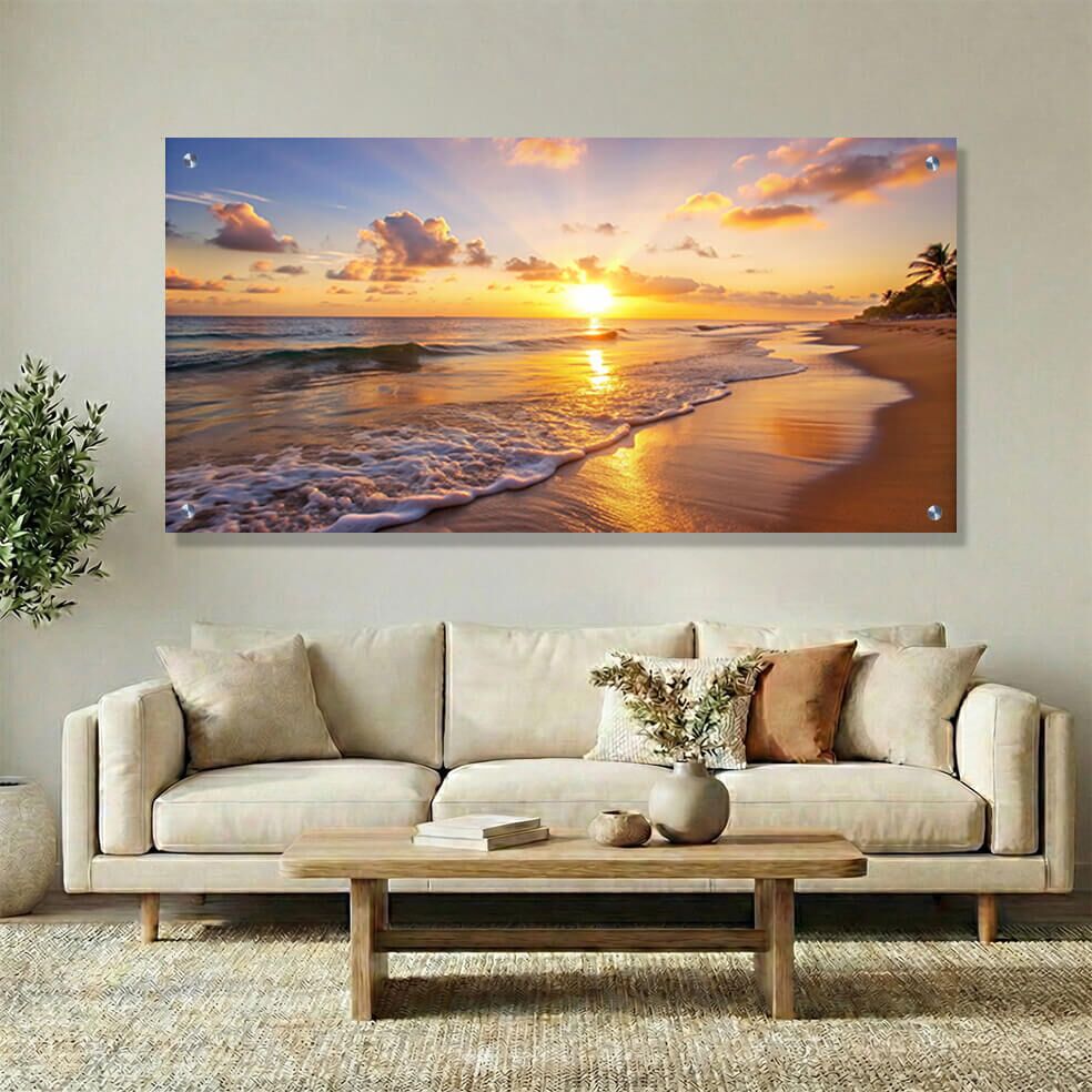 הדפסה על זכוכית מרהיבה המציעה תמונת זכוכית פנורמית לרוחב של נוף חוף טרופי עוצר נשימה. גלים לבנים מתנפצים על החוף תחת שקיעה זהובה שמפזרת אור רך מעל האוקיינוס הטורקיז. הקומפוזיציה מציגה הרמוניה טבעית בין הצבעים החמים של השקיעה והקור המרגיע של הים, ומעוררת תחושת שלווה וקסם ים תיכוני. תמונות זכוכית לסלון עם נושא של חוף ים ונוף טבעי הן בחירה אידיאלית להוספת אווירה רעננה וייחודית במרחב המגורים שלכם. תמונה על זכוכית זו משלבת איכות וסטייל, ומעשירה כל חלל באמצעות הדפסה על זכוכית ייחודית המבליטה כל פרט.