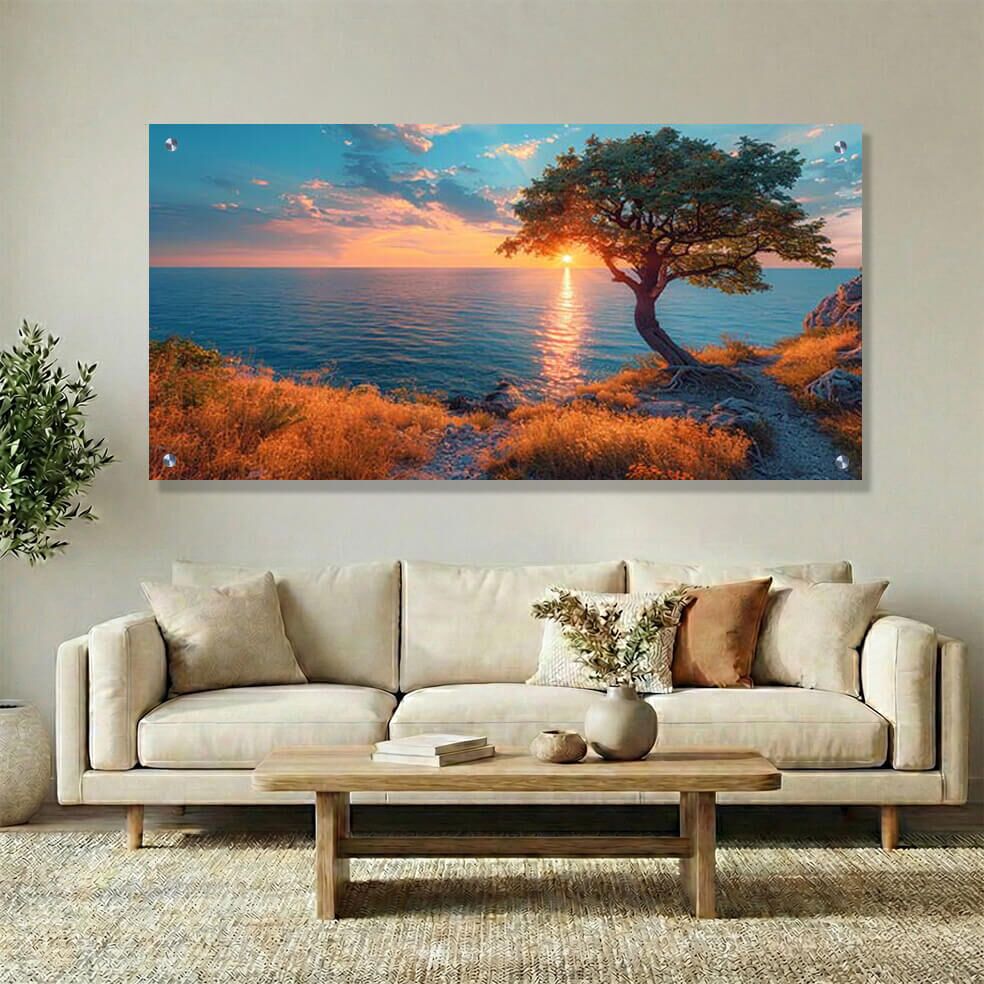 גלו את היופי של עץ בודד העומד על צוק המשקיף אל ים טורקיז מרהיב, מוקף בשיחים בגוונים כתומים חמים, תחת שקיעה זהובה זורחת. תמונה על זכוכית זו מציגה קומפוזיציה פנורמית לרוחב שמדגישה את המרחבים הפתוחים והצבעוניות הטבעית בשעות הערב. הדפסה על זכוכית איכותית מאפשרת לתמונות זכוכית לסלון לחשוף כל פרט ויוצר אווירה שלווה וקסומה, עם הדגשה טבעית של הטקסטורות והגוונים העמוקים של השקיעה והים. זוהי תמונת זכוכית שמשלבת אמנות וטבע למראה מרהיב שמזמין לרוגע והתבוננות.