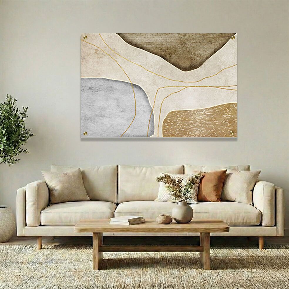 תמונה על זכוכית זו מציגה קומפוזיציה אבסטרקטית מרהיבה המשלבת צורות אורגניות גדולות בצבעים חום כהה, אפור-כחול, זהב ושמנת, המשתלבים יחד בהרמוניה עדינה. קווי זהב עדינים מתחברים לקומפוזיציה ומוסיפים אלמנט של יוקרה ועדינות. תמונה זו מדגישה את היופי שבשילוב צבעים וטקסטורות באווירה אמנותית וייחודית, ומתאימה מאוד לתמונות זכוכית לסלון היוצרות אווירה של מודרניות ואלגנטיות. ההדפסה על זכוכית מגבירה את העומק והברק של הצבעים, מה שהופך את תמונת הזכוכית הזו לפיסת אומנות עכשווית עם נוכחות מרשימה.