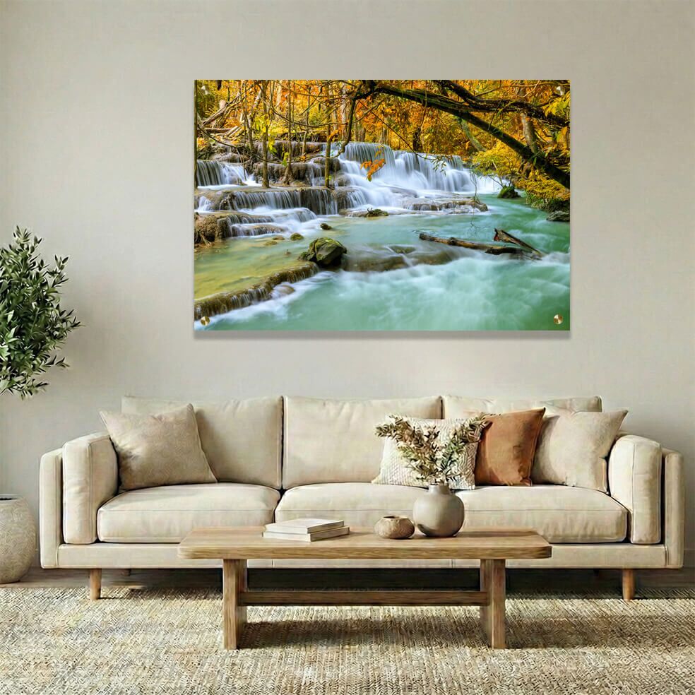 תמונת זכוכית מרהיבה המתארת מפלים מדורגים של מים בצבע ירוק-טורקיז המשתלבים באופן זורם בתוך יער סתווי. הענפים המתפתלים מעל והאבנים הטבעיות מוסיפים עומק ואווירה קסומה לעיצוב הכולל. באמצעות הדפסה על זכוכית, התמונה מעניקה מראה ייחודי ואלגנטי, שמביא את יופיו של הטבע אל תוך הבית. תמונות זכוכית לסלון מסוג זה מציעות איכות חזותית גבוהה, ומבטיחות להבהיר כל חלל עם הטבע במיטבו. התמונות הזכוכית והצילום המקורי משדרים רוגע וייחודיות, והופכים כל חלל למקום של השראה ושלווה.