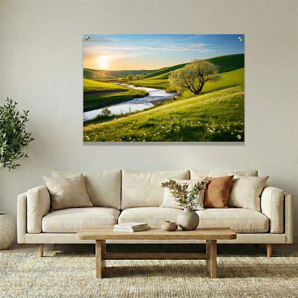 התמונה על זכוכית מציגה נוף כפרי אביבי פורח וקסום, המאופיין בגבעות ירוקות ומוריקות, נהר מתפתל בעדינות שעובר בין השדות, ועץ בודד המוסיף פוקוס מיוחד לקומפוזיציה. אור שמש זהוב מאיר את הסצנה ומחמם את הצבעים הטבעיים, ויוצר אווירה של שלווה והרמוניה. הדפסה על זכוכית מדגישה את צבעי הטבע העזים ומביאה חיים לתמונת הזכוכית, שהופכת לאלמנט מרכזי בעיצוב הבית. תמונות זכוכית לסלון מסוג זה מוסיפות מתח ואווירה נעימה, ומעניקות מראה קסום ואלגנטי לכל חלל מגורים. זוהי תמונה על זכוכית איכותית, המשלבת את יופיו של הנוף עם טכנולוגיית ההדפסה המתקדמת ביותר, כך שתמונת זכוכית זו תלווה אתכם לאורך זמן ותשדרג את עיצוב הסלון שלכם.