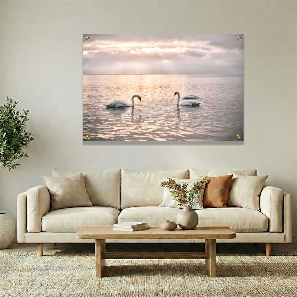 תמונה על זכוכית המציגה זוג ברבורים לבנים על ים שקט שמציג השתקפות זהובה. השמים ערפליים ומשרה אווירה של שחר קסום ורוגע עמוק. הדפסה על זכוכית איכותית זו משדרת תחושת שלווה ואלגנטיות לצד צבעים רכים המשלבים לבן, זהב וגוונים של אפור ועננים נעימים. תמונת זכוכית זו מתאימה לאווירה טבעית והרמונית, ומעשירה את סלונכם עם פרטים עדינים וקומפוזיציה מלבנית לרוחב שמדגישה את השקט והיופי שבטבע. תמונות זכוכית לסלון בסגנון זה מביאות חמימות ויצירת אווירה מזמינה לבית.