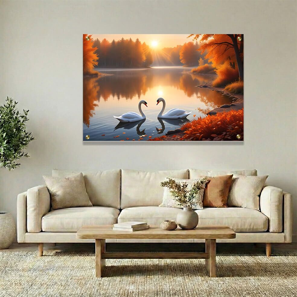 הדפסה על זכוכית ייחודית זו מציגה זוג ברבורים לבנים מפורטים ורומנטיים על אגם שקט, מוקפים ביער סתווי בצבעי אדום וכתום עשירים, תחת אור שקיעה זהוב שמוסיף חום וקסם לתמונה. תמונת זכוכית זו משלבת הרמוניה של צבעים טבעיים עם קומפוזיציה מלבנית לרוחב, המושלמת לקישוט חללים עם אווירה רגועה ומתוחכמת. תמונות זכוכית לסלון מסוג זה מעניקות תחושת שלווה, ולכן הן פופולריות לשדרג את אווירת החדר. תמונת זכוכית זו מעוטרת בפרטים המדגישים את היופי של נופים וטיולים בטבע, ומדגישה את האינטראקציה המרהיבה בין האור וצלליות העצים לבין הדמות המרכזית של זוג הברבורים.