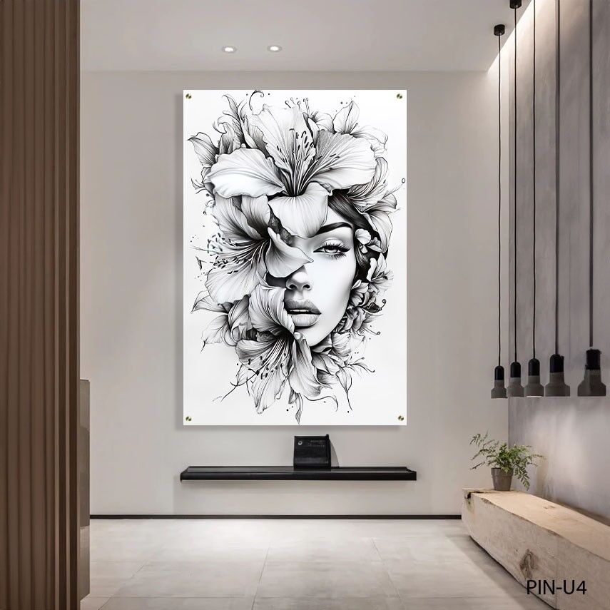 תמונה מרשימה ומעוררת השראה המציעה דיוקן של אישה בשחור לבן, מוקפת בפרחי שושן עדינים. הקומפוזיציה המלבנית לאורך יוצרת תחושה של עומק ואיזון הרמוני בין הפורטרט הפרטי לפרחים הטבעיים, המעניקים דינמיות ועדינות יחדיו. ההדפסה על זכוכית מביאה לידי ביטוי את דקויות הפרטים והניגודים שבשחור לבן בצורה בולטת ומפוארת, והשימוש בתמונת זכוכית מגביר את איכות התמונה ויוצר תחושת שקט ואלגנטיות. מתאים במיוחד כתמונות זכוכית ללובי בניין, המעניקות אווירה מיוחדת ומזמינה תוך שילוב של אמנות מודרנית ותחושת טבע עדינה.
