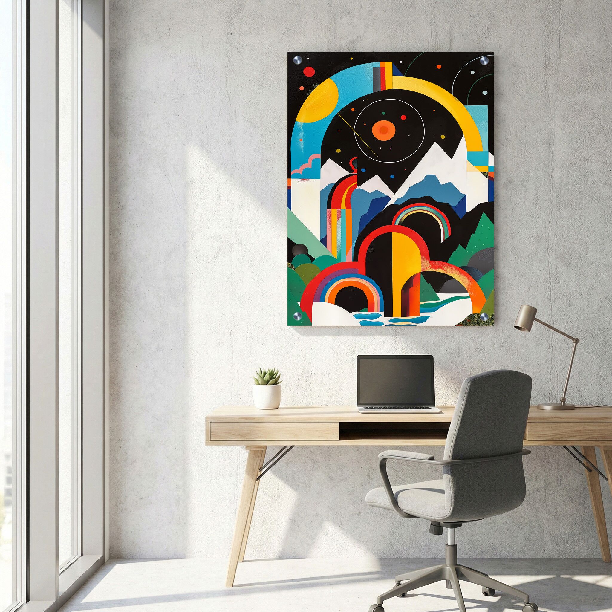 תמונת זכוכית זו מציגה קומפוזיציה מופשטת וייחודית הכוללת קשתות הרים ופלנטות צבעוניות המונחות על רקע שחור עשיר. ההדפסה על זכוכית מדגישה את האסתטיקה העשירה והחלקה של הצבעים, תוך יצירת ניגודיות מרשימה המוסיפה לעומק המראה הכולל. תמונה על זכוכית זו היא דוגמה מצוינת לשימוש באלמנטים אבסטרקטיים שמתחברים בהרמוניה גדולה, ומהווה השראה לתמונות זכוכית למשרד המשתלבות בעיצוב מודרני ואלגנטי. איכות ההדפסה הגבוהה מאפשרת לכל פרט וצבע להתבלט וליצור חוויית צפייה מרעננת ומזמינה.
