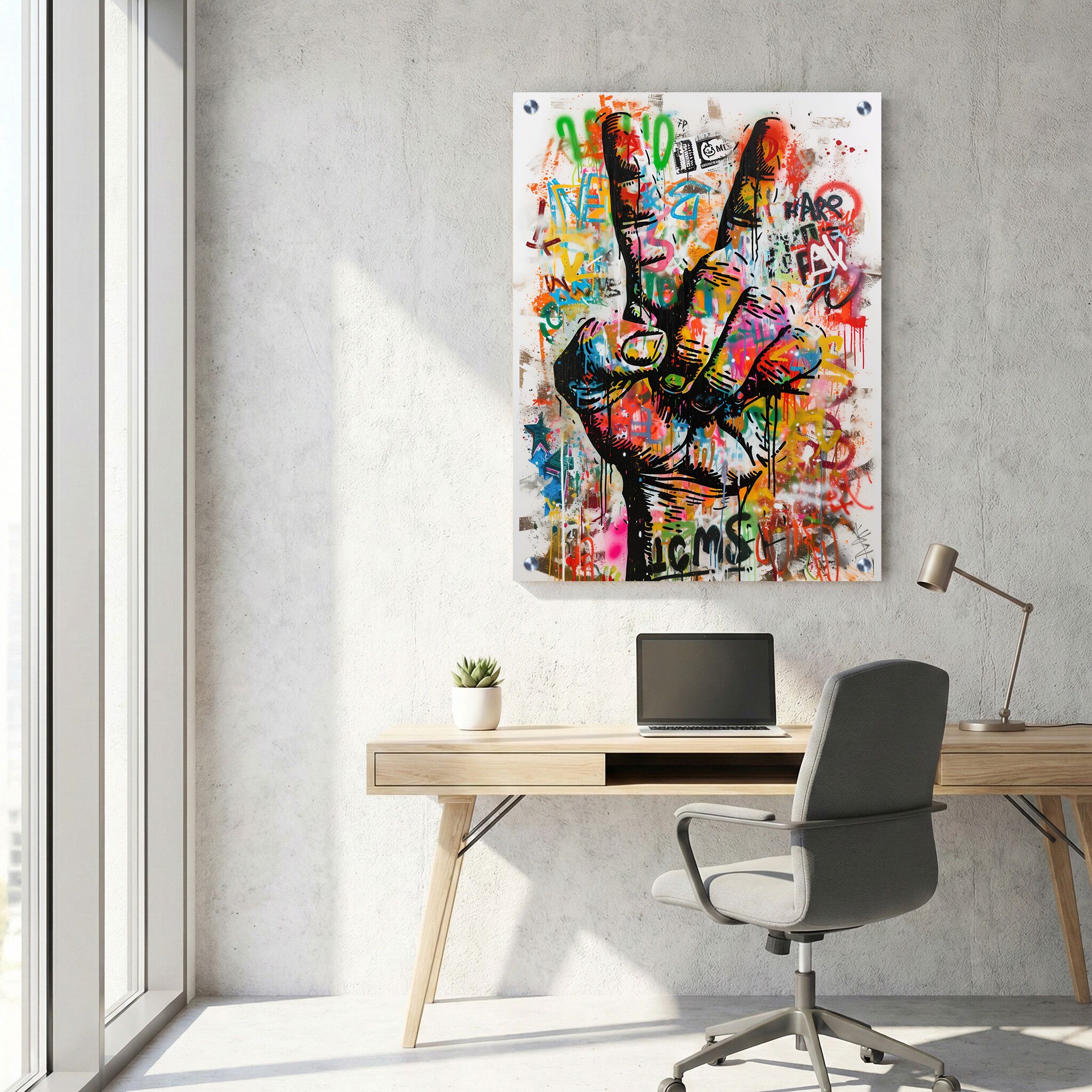 תמונת זכוכית למשרד המדגימה יד עושה סימן שלום בסגנון גרפיטי צבעוני עם כתובות, המשלבת יצירת אמנות אורבנית ואלמנטים גרפיים מודרניים. ההדפסה על זכוכית יוצרת מראה מבריק וחיות בצבעים שמעניקים תחושת רעננות ודינמיות לכל משרד. תמונה על זכוכית זו מציגה קומפוזיציה מלבנית לאורך, שמשדרגת את האווירה עם איכות ויזואלית גבוהה, ומתאימה במיוחד לחדשנות ורוח צעירה בסביבת העבודה. בין אם בוחרים בתמונות זכוכית למשרד או כל חלל אחר, היצירה הזו מעניקה שילוב של אומנות גרפיטי וסגנון מודרני בהדפסה על זכוכית איכותית, היוצרת נוכחות חזקה ומרהיבה.
