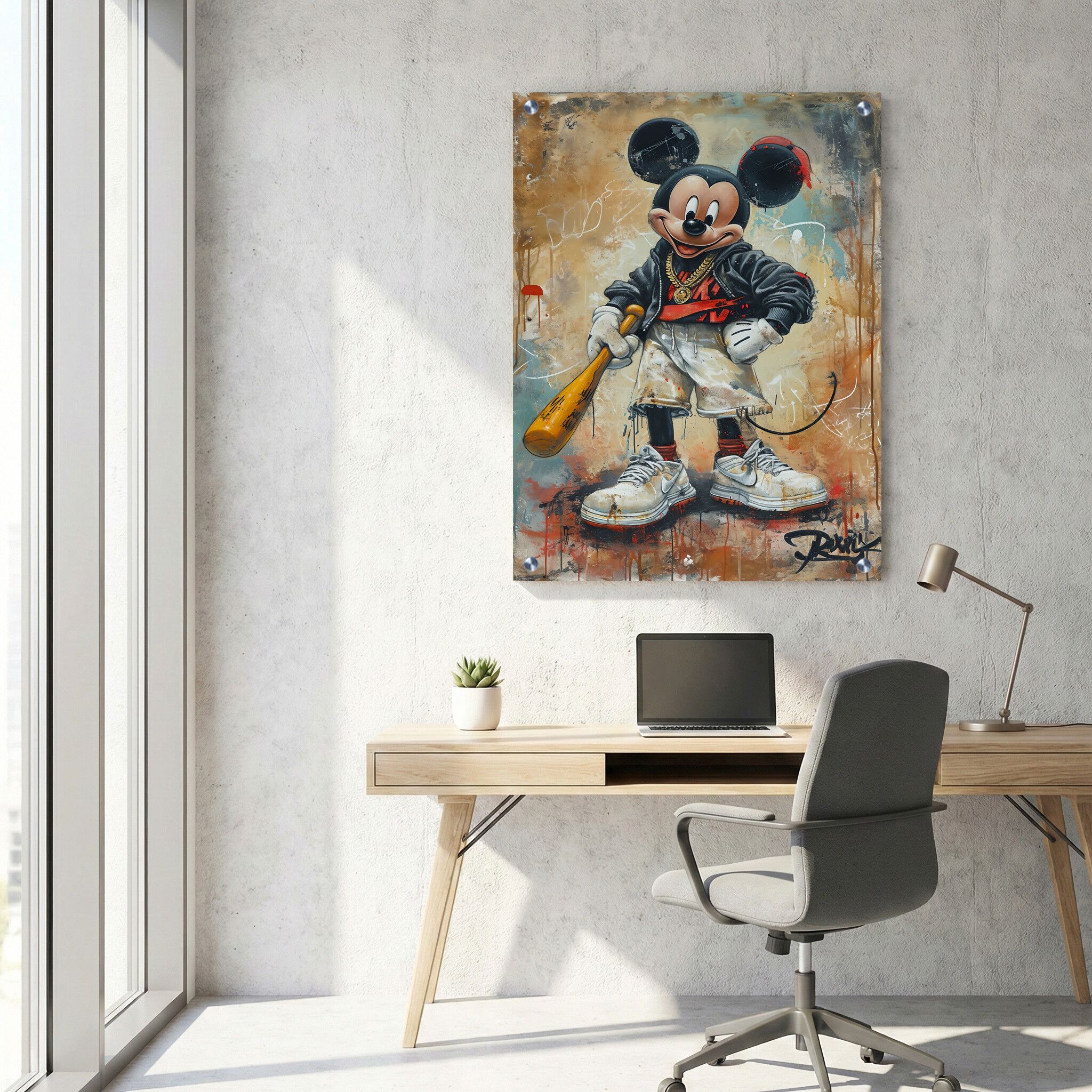 תמונת זכוכית זו מציגה הדפסה על זכוכית בסגנון גרפיטי אורבני, עם דמותו של מיקי מאוס המחזיק מחבט בייסבול. הקומפוזיציה מלבנית לאורך, ומעניקה תחושה מודרנית ונועזת המשלבת תרבות הפופ עם אלמנטים אומנותיים רחוב. הצבעים חיים ודינמיים, ומקנים לתמונה מראה עכשווי ומעניינים, המתאימים במיוחד לתמונות זכוכית למשרד המעוררות השראה ויצירתיות. תמונה על זכוכית מסוג זה משלבת בין סגנון ויזואלי ייחודי לבין איכות גבוהה של הדפסה, ומתאימה כתמונת זכוכית ייחודית למרחבי עבודה מודרניים.