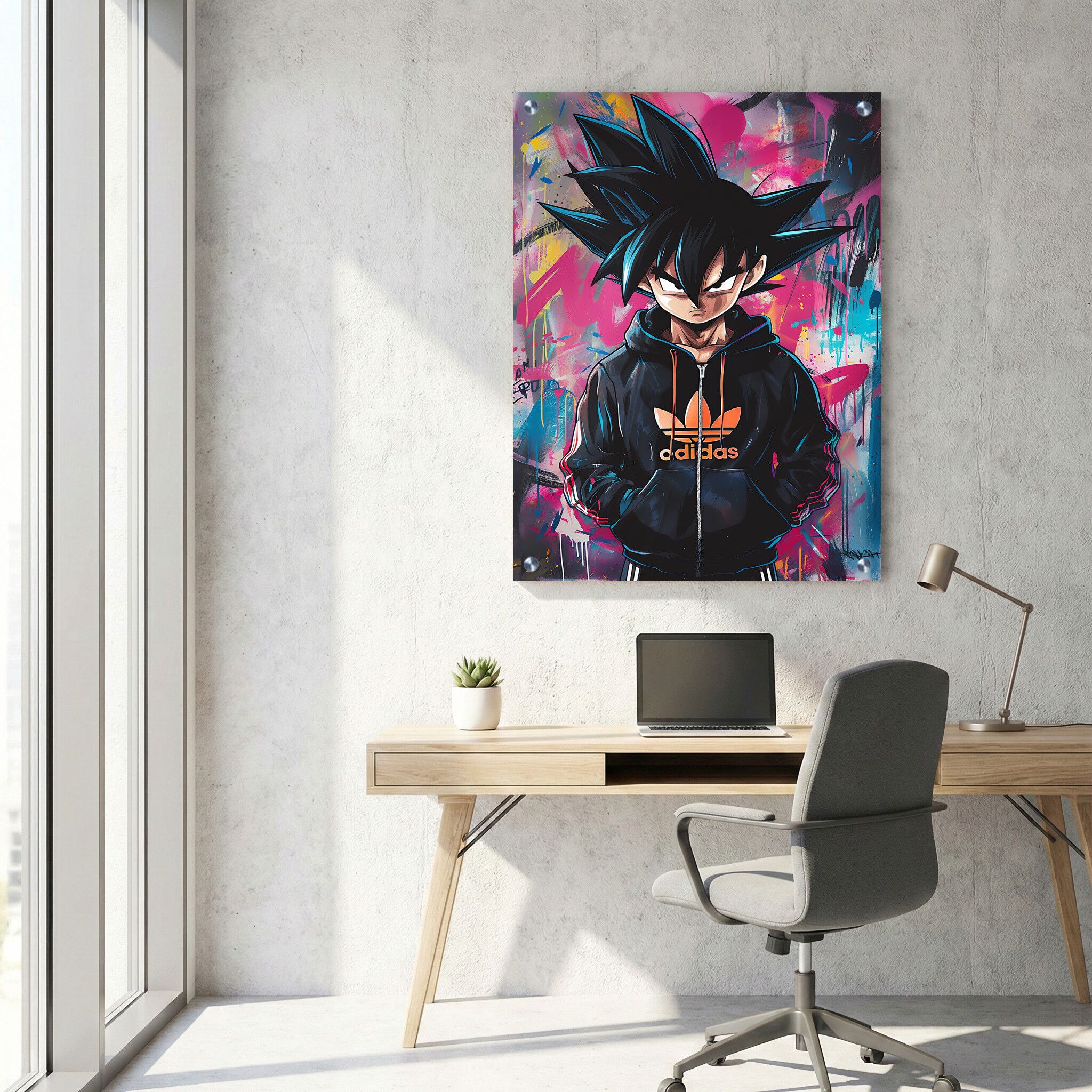 תמונה על זכוכית בסגנון עכשווי ומודרני, המציגה דמות אנימה עם קפוצ'ון אדידס שחור, המונחת על רקע גרפיטי ורוד צבעוני מרהיב. הקומפוזיציה המלבנית לאורך מדגישה את הפרטים והצבעוניות הענפה של הגרפיטי, בשילוב עם הדמות הקולית שיוצרת אווירה אורבנית צעירה ונעימה. תמונה זו מתאימה במיוחד כתמונות זכוכית למשרד, ומוסיפה נגיעת אמנות וטרנדיות לחלל העבודה. באמצעות הדפסה על זכוכית איכותית, התמונה מציגה עומק וחדות צבעים, ומוסיפה ייחודיות ועיצוב מיוחד לכל חלל.
