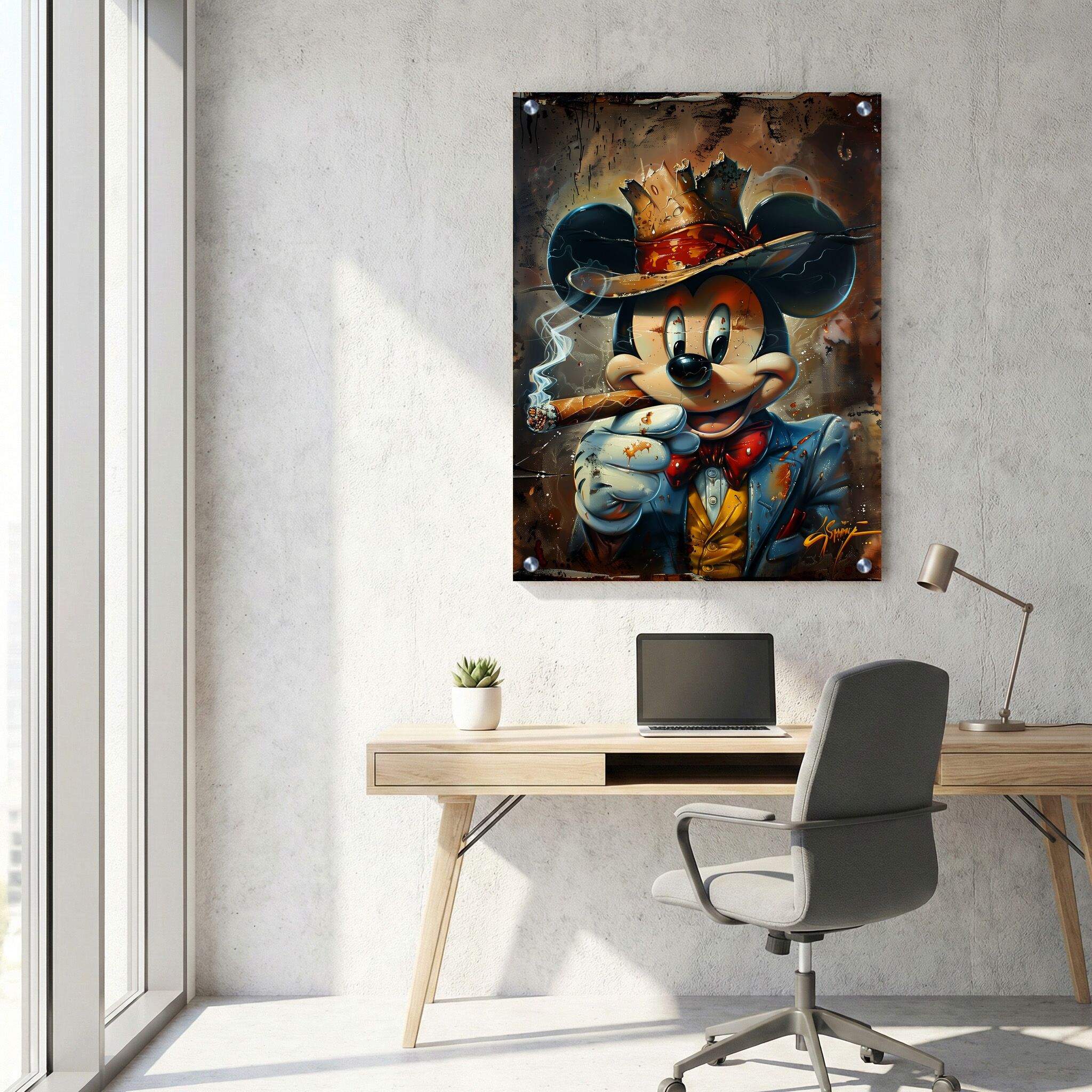 תמונת זכוכית מהממת ומיוחדת המציגה את מיקי מאוס עם כתר ועישון סיגר, לובש חליפה כחולה, על רקע חום כהה מעושן. ההרכב המלבני לאורך מדגיש את הדמות המרכזית באופן אלגנטי ומקוריים, נותן תחושת עומק ואלגנטיות. הדפסה על זכוכית באיכות גבוהה מאפשרת להבליט את הצבעוניות החמה והכחולה באופן ברור ומבריק, ושומרת על חדות ופרטים עדינים. תמונות זכוכית למשרד זו מהוות בחירה מצוינת להוספת נגיעה יצירתית וייחודית לאווירה העסקית, ומובילות עיצוב מסוגנן ומרענן לכל חלל. תמונה על זכוכית זו משלבת בין וינטאג' לפופ ארט, ומציעה נגיעה של הומור ואלגנטיות יחד.