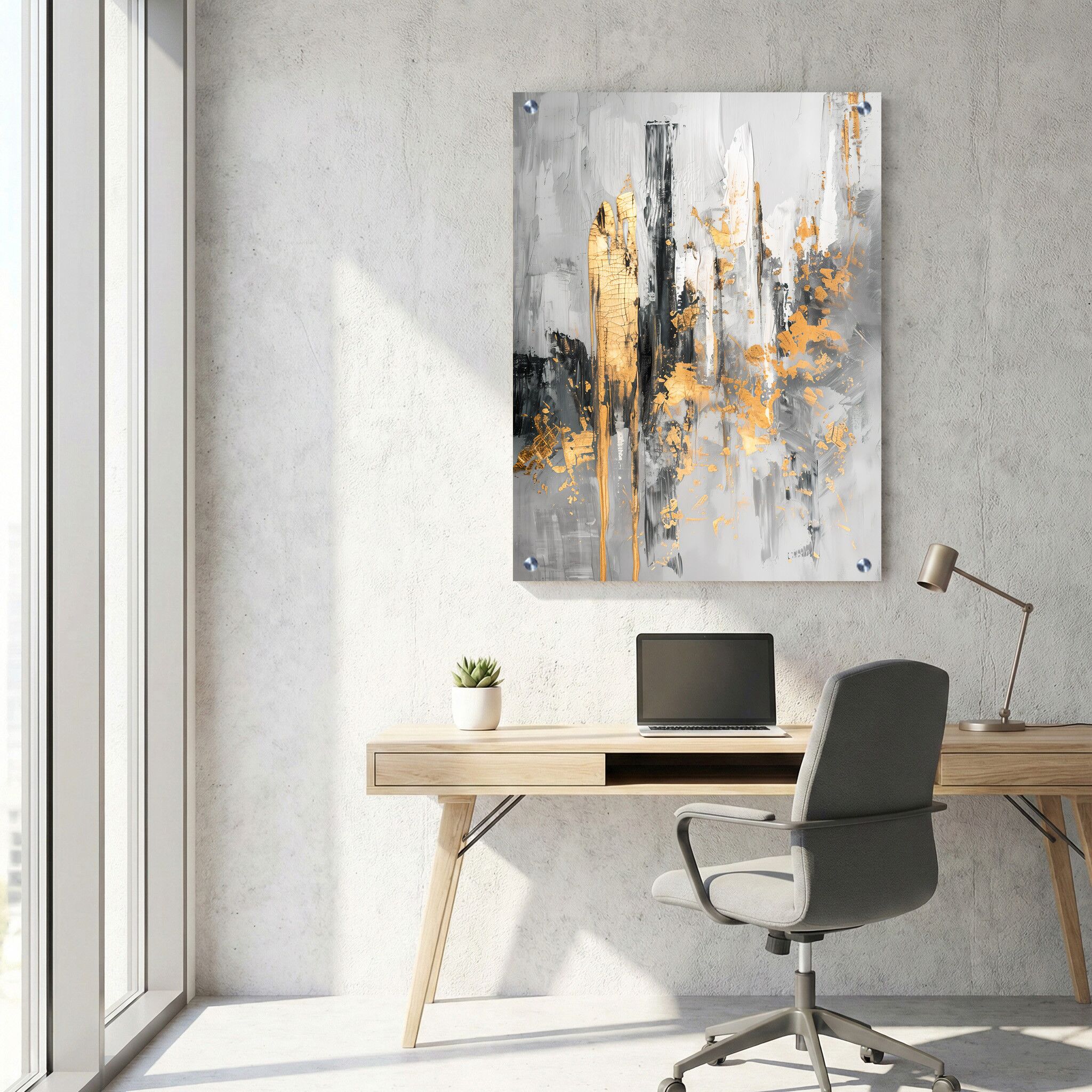 תמונה על זכוכית בעלת עיצוב אבסטרקטי המלכדת גוונים של אפור עם אלמנטים זהובים ושחורים, היוצרים קומפוזיציה עשירה ומודרנית. היצירה מלבנית לאורך, ומדגישה ניגודים עדינים בין הצבעים השונים. תערובת הצבעים והמבנה ההרמוני יוצרת אווירה אלגנטית ומרגיעה המתאימה לתמונות זכוכית למשרד. הדפסה על זכוכית מעניקה להדפס מראה בהיר, עם עומק ועשירות שמתאימים לעיצוב מינימליסטי ועכשווי. תמונת זכוכית זו מהווה אביזר עיצובי מודרני ויוקרתי עם חוויית אמנות שונה, אשר ישדרג כל משרד בצורה בולטת ומרשימה.