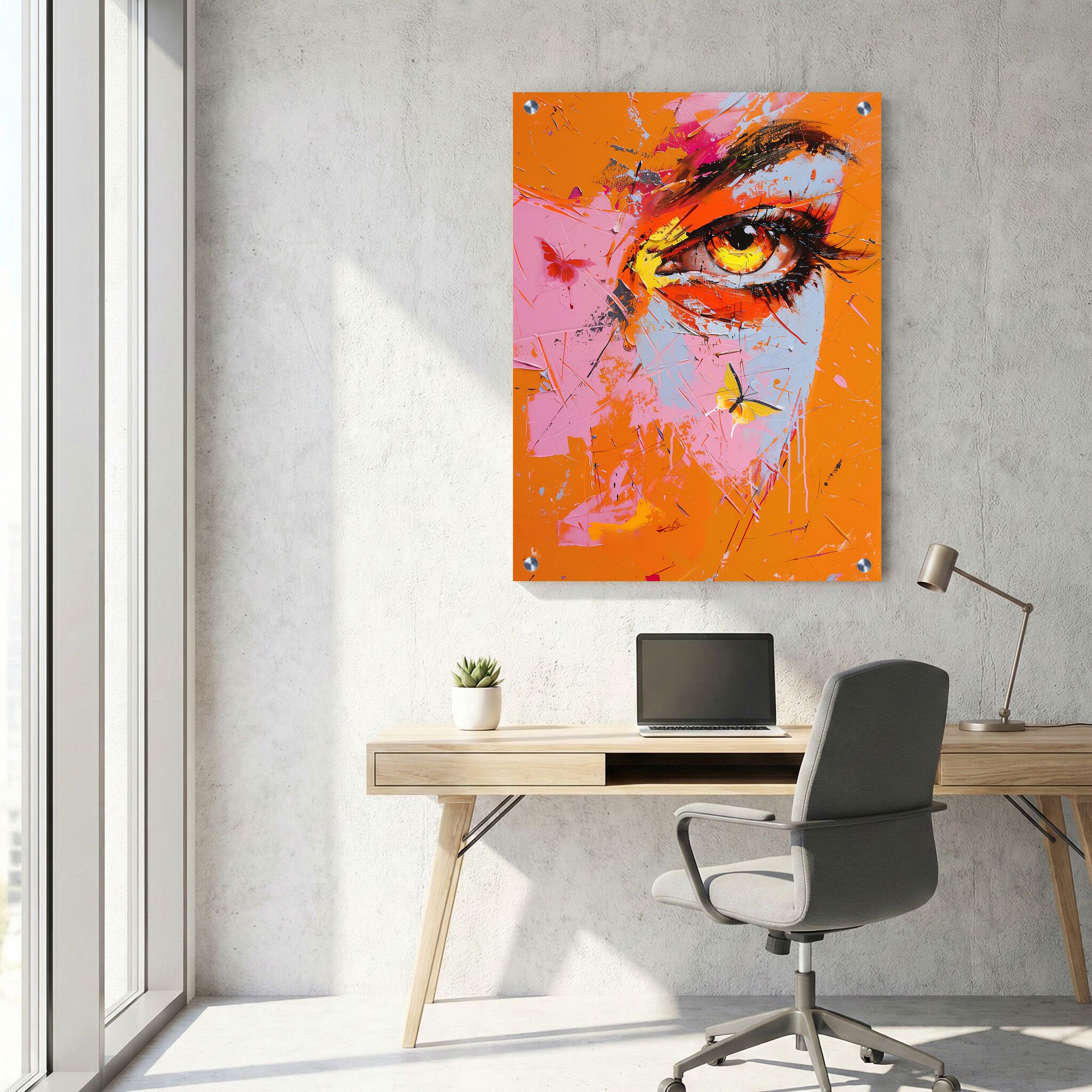 תמונה על זכוכית בכל גווני הכתום והורוד העזים, המציגה עין אישה קלוז אפ בקומפוזיציה מלבנית לאורך. ההדפסה על זכוכית משדרת עוצמה וייחודיות, עם דגש על צבעים חמים שמביאים נוכחות ורגש למרחב העבודה. תמונות זכוכית למשרד מסוג זה מתאימות להפוך כל סביבה למקור השראה, ומעצימות את האווירה בעזרת נגיעות אומנותיות ייחודיות של עיצוב מודרני.