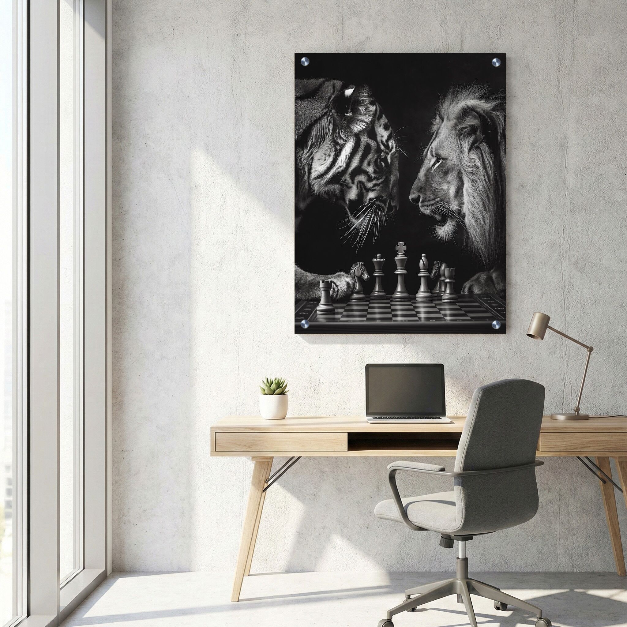 תמונה על זכוכית המציגה נמר ואריה המשחקים שחמט בשחור ולבן, באופן מלבני לאורך שמדגיש את המתח והאסתטיקה שבמשחק. ההדפסה על זכוכית זו משלבת קונטרסטים חזקים בין הצבעים, המעצימים את תחושת העומק והדינמיות שבקומפוזיציה. תמונות זכוכית למשרד מסוג זה מעניקות אלמנט של ייחודיות ויצירתיות, המתאים במיוחד לשילוב במרחבים מקצועיים. תמונת זכוכית זו מדויקת בפרטים ומבהירה את ייחודו של רגע המשחק המרתק בין שני הטורפים, ומוסיפה נגיעה של אלגנטיות וסטייל לכל משרד.
