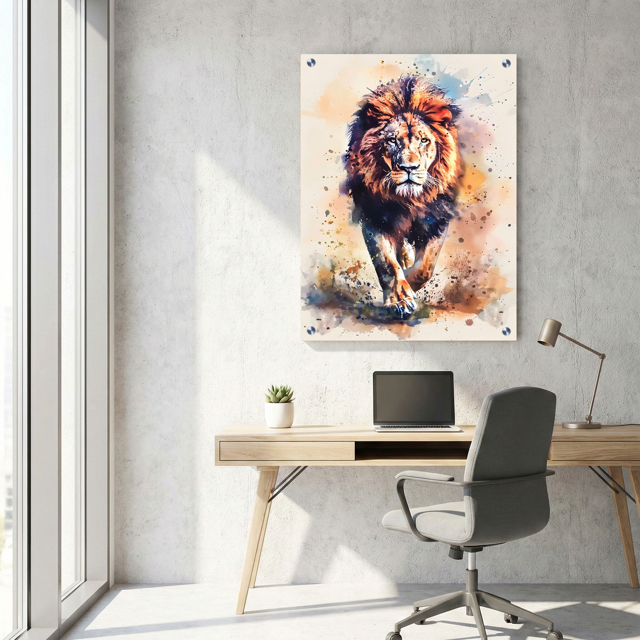 תמונה על זכוכית למשרד שמציגה אריה רץ קדימה, בעיצוב צבעי מים רך עם ניצוצות זוהרים שמוסיפים דינמיות והשראה. ההדפסה על זכוכית משלבת קומפוזיציה מלבנית לאורך, המדגישה את התנועה והעוצמה של האריה. תמונת זכוכית זו משתמשת בגוונים טבעיים ומשלבת את היצירתיות של הדפסה מקצועית ליצירת אווירה של השראה וכוח, מתאימה במיוחד לתמונות זכוכית למשרד המעוניינים להוסיף אלמנט של עוצמה ויופי אמנותי. תמונות זכוכית מסוג זה מאפשרות לשלב אומנות טבעית עם טכנולוגיה מתקדמת, שמתאימה לכל משרד מודרני המעוניין להעניק סביבה מעוררת ומקצועית.