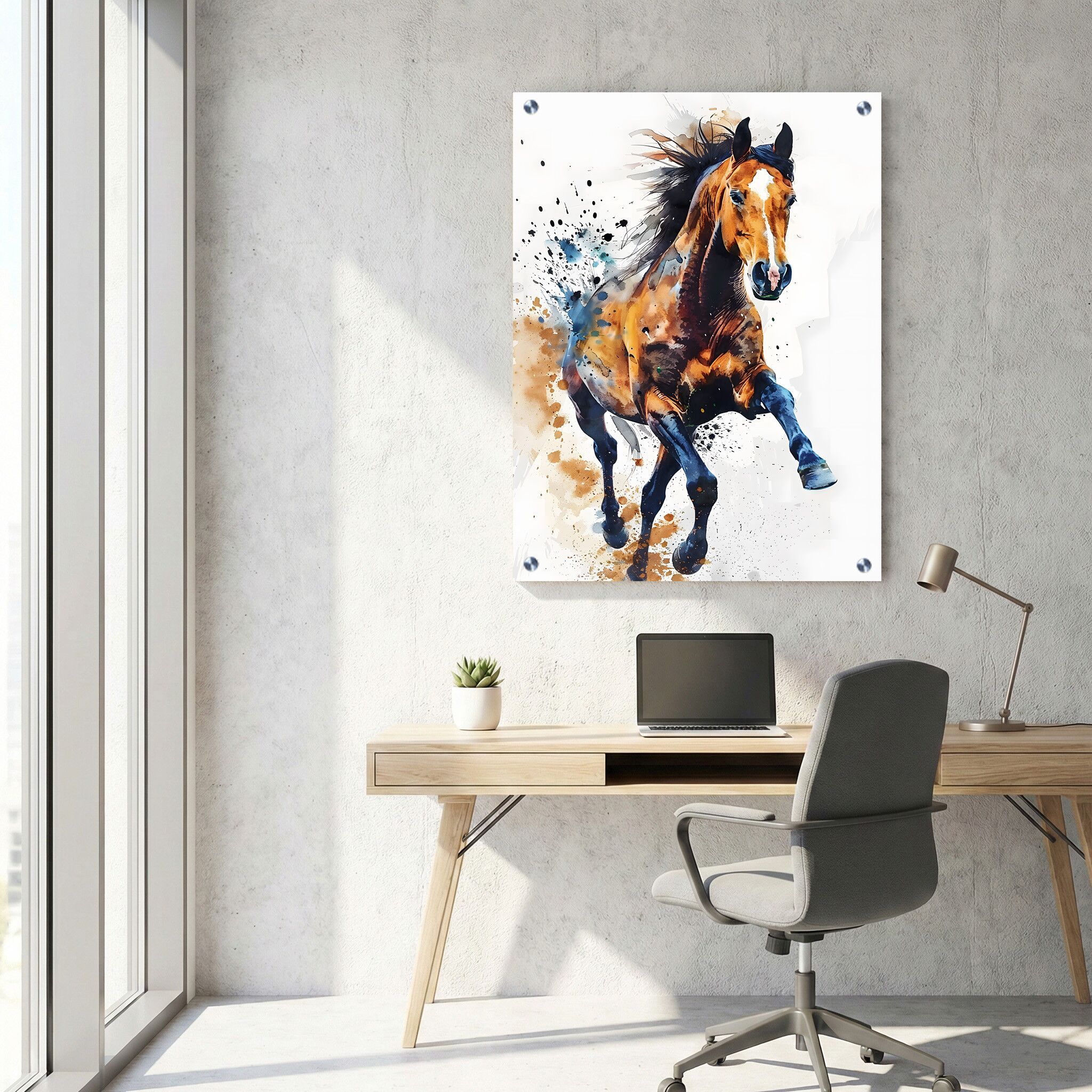 התמונה על זכוכית מציגה סוס דוהר בסגנון צבעי מים מרהיב, המלווה בניצוצות כחולים היוצרים תחושה של תנועה ודינמיות. ההדפסה על זכוכית מעבירה את העדינות והחיות שבצבעי המים תוך משחק רך בין הצללים והאור. תמונות זכוכית למשרד בקטגוריה זו מביאות אלמנט של השראה וחדשנות, המשלב אמנות עם טכנולוגיית הדפסה מדויקת. תמונת זכוכית זו יוצרת אווירה של אנרגיה חיובית המשלבת אומנות וטבע, מתאימה במיוחד למרחבים מקצועיים המעוניינים באפקט ויזואלי מרגש ונקי.