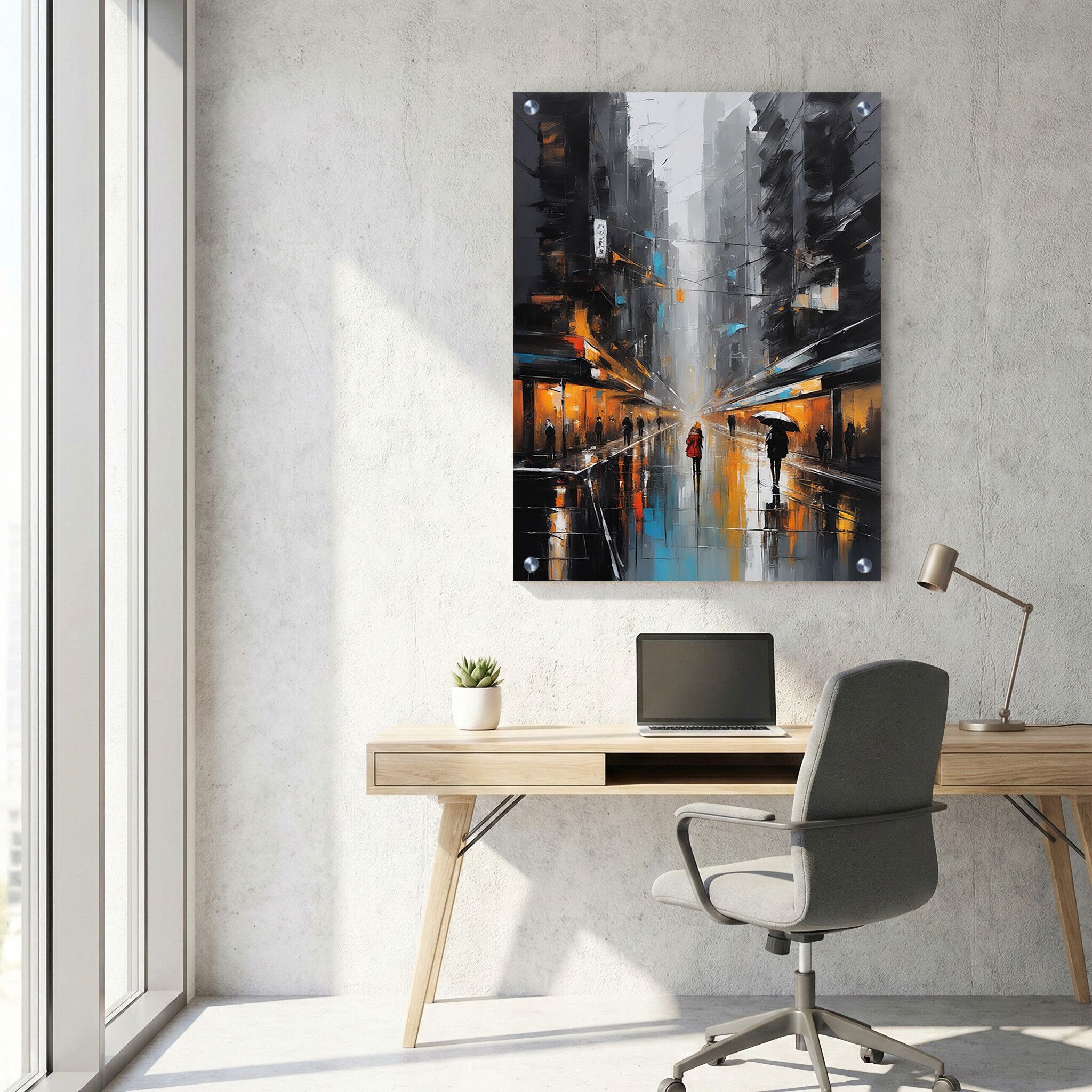 תמונה על זכוכית המדגימה נוף רחוב עירוני גשום בלילה בשילוב אנשים הנמצאים תחת מטריות בגווני זהב ואפור נעימים לעין. הקומפוזיציה המלבן לאורך נותנת תחושת עומק ורוחב, המשדרת אווירת עיר תוססת ורגועה בעת ובעונה אחת. הדפסה על זכוכית זו יוצרת משחקי אור וצל המחזקים את התחושה של הלילה הגשום ועושים את התמונת זכוכית למשרד לאובייקט עיצובי מרהיב ומזמין. תמונות זכוכית הן פתרון אידיאלי לעיצוב משרדים אקסקלוסיביים, והיצירה הזו משלבת אלמנטים אורבניים בגווני זהב ואפור המאזנים בין צבעים חמים וקרים, מה שמוסיף למראה המודרני והאלגנטי. עם תמונות זכוכית למשרד כמו זו, תוכלו להעניק אווירת עיר מיוחדת המשלבת רוגע ודרמה כאחד.