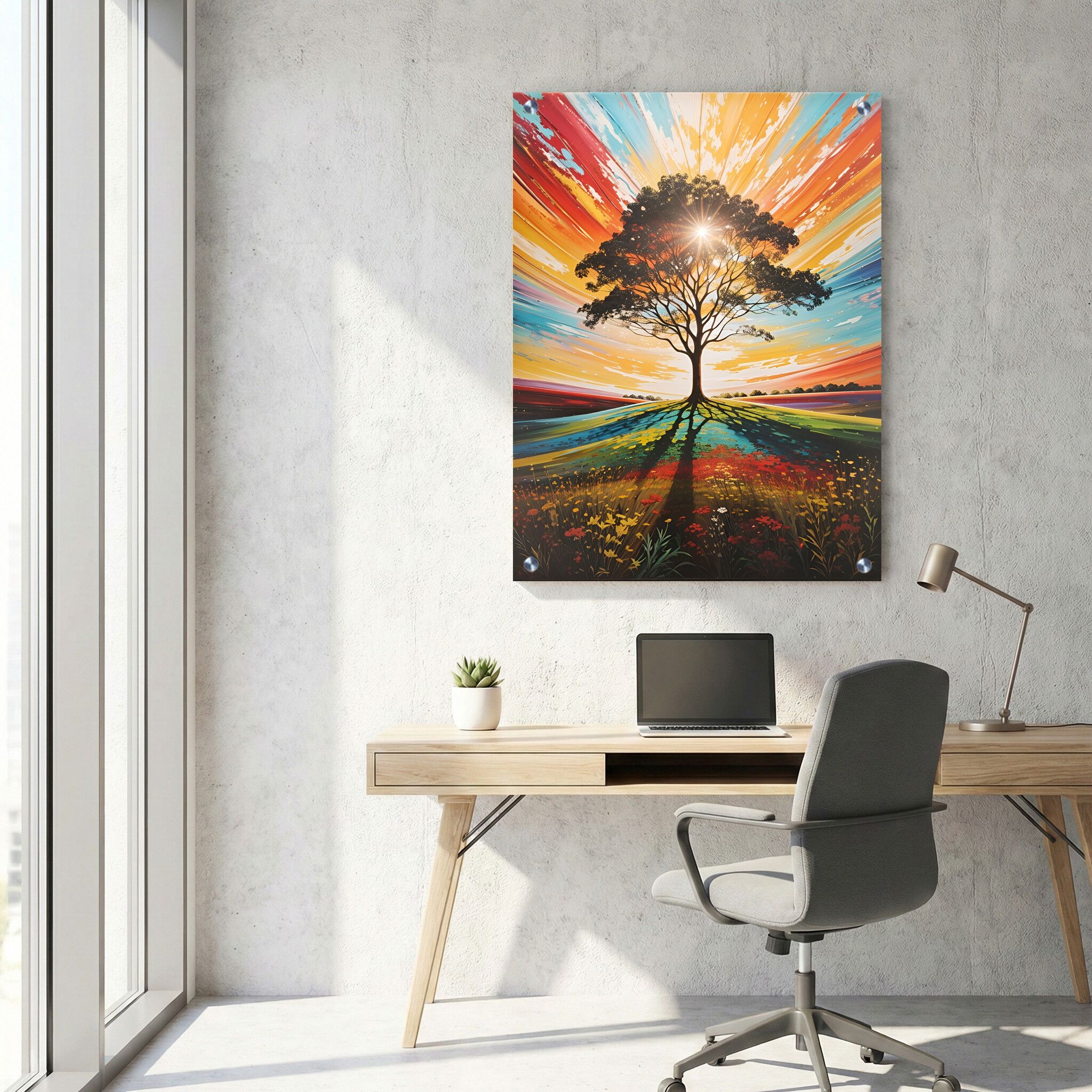 הדפסה על זכוכית מרהיבה שמציגה עץ בודד תחת שמש זוהרת עם שמיים צבעוניים מעל שדה קסום של פרחים. קומפוזיציה מלבנית לאורך המדגישה את האווירה הטבעית, השלווה והחיה של הסביבה. תמונת זכוכית זו מתאימה במיוחד כקישוט במקום העבודה, ומוסיפה נופך של צבע וחיוניות לכל משרד. בזכות השילוב המדויק של צבעים וצורות, התמונה על זכוכית יוצרת תחושת עומק ומטרתה להעביר השראה ורוגע. תמונות זכוכית למשרד מסוג זה מהוות בחירה איכותית ומוקפדת למי שמעוניין להוסיף נגיעה של טבע ואמנות סביבתית במרחב העבודה.