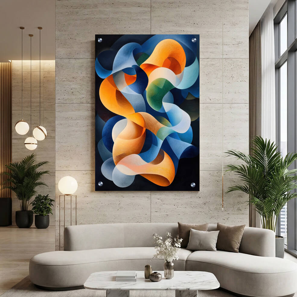 תמונת זכוכית מרהיבה המציגה קומפוזיציה אבסטרקטית עם צורות תלת-ממדיות מסתובבות בצבעי כחול, כתום וטורקיז על רקע כהה. ההדפסה על זכוכית יוצרת עומק חזותי ומוסיפה נופך עכשווי וייחודי לחלל עם תמונות זכוכית לסלון. תמונה על זכוכית זו משלבת בצורה נהדרת בין אלמנטים גאומטריים לאמנות אבסטרקטית, ומציעה אפשרות לשדרוג הקירות בעיצוב מודרני ומסוגנן. תמונת זכוכית זו מתאפיינת באוריינטציה מלבנית לאורך, ומספקת ניקוד עיצובי מיוחד לכל חדר שדורש נגיעה של צבע ותנועה. תמונות זכוכית הן פתרון אלגנטי ואיכותי לעיצוב פנים, המתאים במיוחד לסגנון עכשווי וחיים דינמיים.