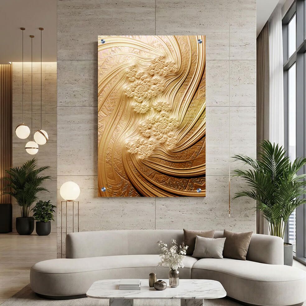 תמונת זכוכית מרהיבה זו מציגה תבליט פרחוני תלת-ממדי בגוון זהב עשיר, הכולל לבלובים ועלים דקים ומעודנים. ההדפסה על זכוכית מדגישה את העומק והמרקם של הציור, ומעניקה תחושה של מראה יוקרתי ומיוחד. תמונות זכוכית לסלון מסוג זה מאפשרות לשלב אמנות קלאסית עם תחושת מודרניות, תוך שימוש בקומפוזיציה מלבנית לאורך שמביאה אלמנט דינמי ועדין לחלל. תמונה על זכוכית זו היא פתרון אידיאלי למי שמחפש להוסיף נגיעה של אלגנטיות ושל שקט ויזואלי עם ניחוח טבעי, באמצעות תמונת זכוכית בצלילים חמים של זהב וחלקים עדינים של פרחים וצמחייה.