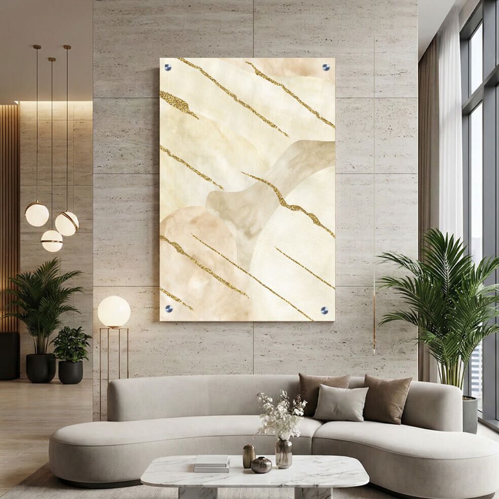 הדפסה על זכוכית יוקרתית עם קומפוזיציה אבסטרקטית המשלבת ורידי זהב אלכסוניים נוצצים על רקע שיש שמנת עדין. תמונה על זכוכית זו מביאה עומק ואלגנטיות דרך שילוב הצבעים החמים והמרקמים המרהיבים, המתאימים במיוחד לתמונות זכוכית לסלון. השימוש בקווים האלכסוניים הדומיננטיים יוצרים תחושה דינמית ומשחק אור מרהיב. תמונת זכוכית זו משלבת אמנות ועיצוב מודרני לאווירה אסתטית וייחודית בביתכם.
