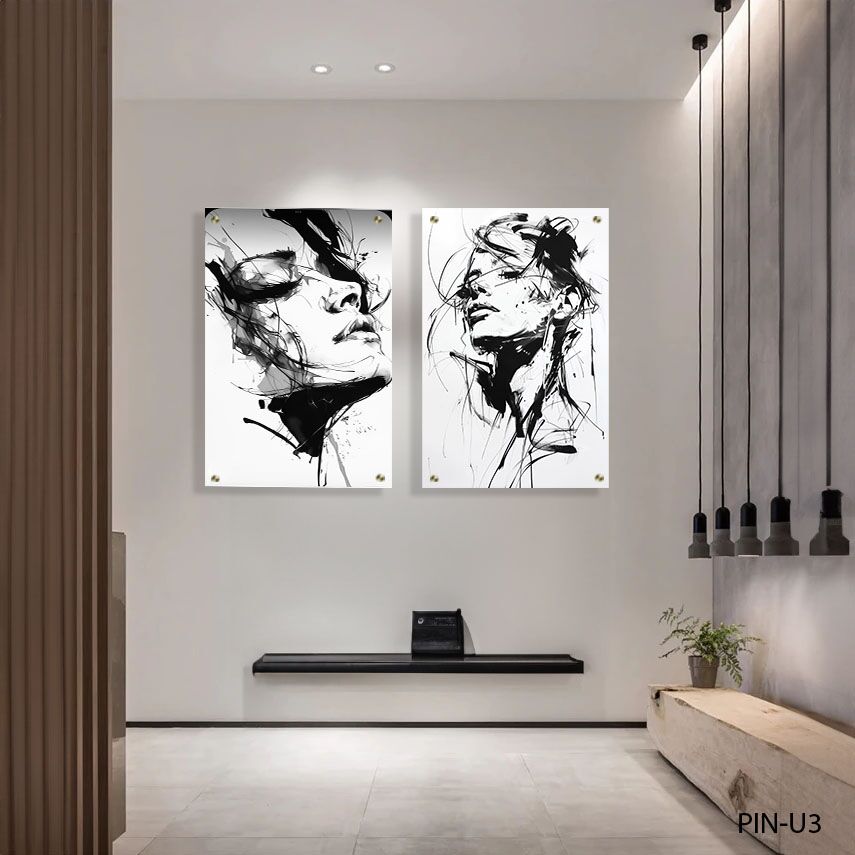 הדפסה על זכוכית זו מציגה זוג תמונות זכוכית המשלבות עיצוב מופשט של דיוקנאות בשחור ולבן. כל תמונת זכוכית מעוצבת בקווים נקיים ופשוטים, המבליטים את המורכבות האמנותית בצורה מינימליסטית ומתוחכמת. תמונה על זכוכית זו יוצרת אווירה עדינה ומודרנית, עם ניגודיות חזקה בין גווני השחור והלבן המוסיפה אלמנט דרמטי ויזואלי. תמונות זכוכית ללובי בניין אלו מתאימות לשדר יוקרה וסטייל מכובד, ומשדרות תחושת רוגע ואלגנטיות בכל מבנה בו הן מוצגות.