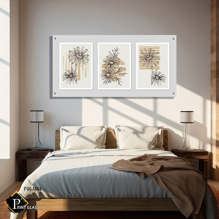 התמונה המרהיבה מציגה שלישיית פרחים המעוצבים בקווים עדינים ואלגנטיים, המונחים על רקע בהיר המרגיע את העין. הצבעים הרכים והקומפוזיציה הפנורמית יוצרים תחושת הרמוניה ושקט, המתאימה במיוחד לעיצוב חדר שינה. ההדפסה על זכוכית מאפשרת הדגשה של הפרטים המוקפדים ויוצרת מראה מודרני ואלגנטי בו זמנית. תמונת זכוכית זו מתאימה לפריטי עיצוב שמשדרים אווירה טבעית ועדינה, והיא מהווה חלק מובלט מתוך מגוון תמונות זכוכית לחדר שינה לעיצוב הבית המודרני והמעודן.
