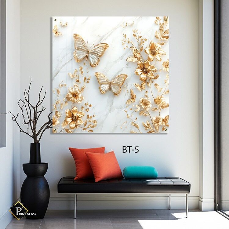 התמונה מציגה הדפסה על זכוכית שמעוטרת בפרפרים ופרחים מוזהבים המונחים בגרציה על רקע שיש לבן חלק ונקי. הקומפוזיציה המרובעת מדגישה את האלמנטים העדינים בצבע הזהב, היוצרים מראה קלאסי ויוקרתי המוסיף זוהר וחן לכל חלל. תמונה על זכוכית זו משדרת תחושת רוגע ואלגנטיות, ומתאימה במיוחד כתמונות זכוכית ללובי בניין המעוניינים בהדגשה של אסתטיקה עשירה ועדינה. תמונת הזכוכית מדגישה את היופי של הפרחים והפרפרים בצורה חיה ומרשימה, והדפסה על זכוכית איכותית זו תעניק לכל לובי בבניין נופך מתקדם וייחודי.