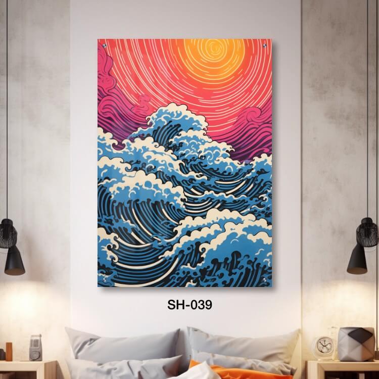 תמונת זכוכית לחדר שינה – SH-039. תמונה על זכוכית יפה של גלים ושקיעה מצוירים . מתאים גם לעיצוב הבית בצורה יוקרתית וייחודית. זכוכית מחוסמת 6מ"מ הדפסה על זכוכית בטכנולוגיה UV חדשנית.