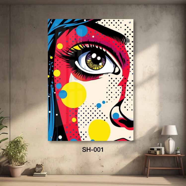 תמונת זכוכית – SH-001. תמונה על זכוכית יפה של חצי פרצוף של אישה בסגנון קומיקס מצויר. מתאים גם לעיצוב הבית בצורה יוקרתית וייחודית. זכוכית מחוסמת 6מ"מ הדפסה על זכוכית בטכנולוגיה UV חדשנית.