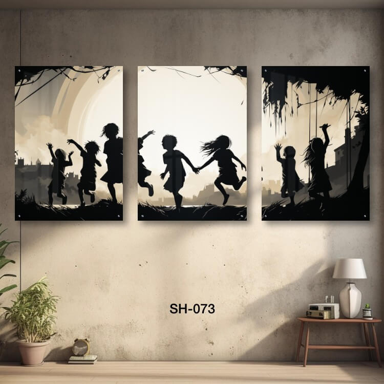 תמונות זכוכית לסלון – SH-073. שלוש תמונות על זכוכית של ילדים משחקים בשחור לבן. מתאים גם לעיצוב הבית בצורה יוקרתית וייחודית. זכוכית מחוסמת 6מ"מ הדפסה על זכוכית בטכנולוגיה UV חדשנית.