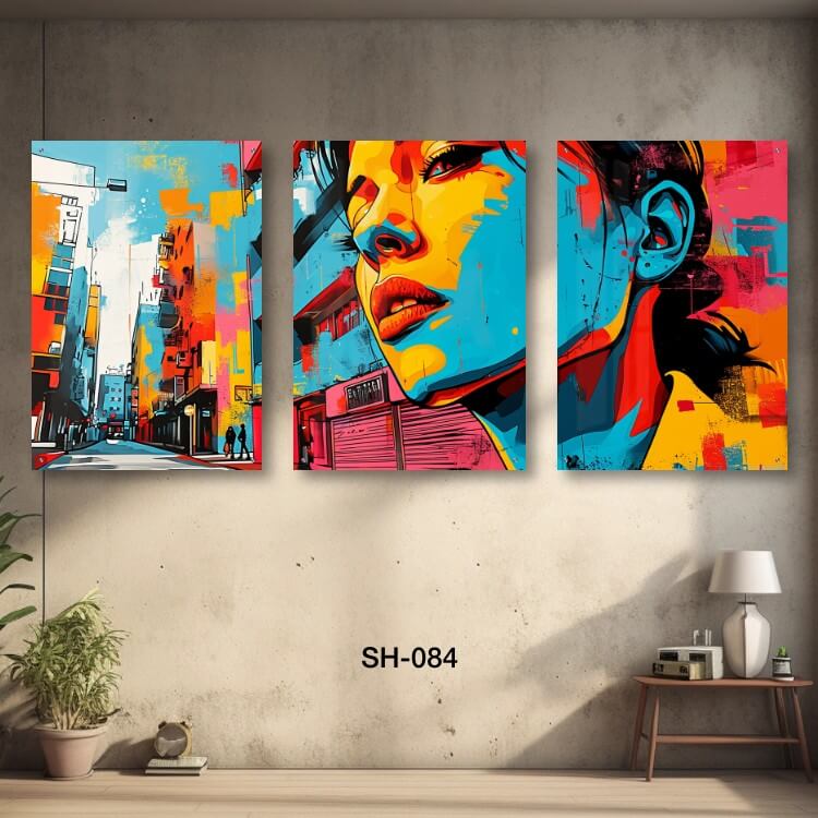תמונות זכוכית לחדר שינה – SH-084. שלוש תמונות על זכוכית של אישה ברחוב בסגנון פופ ארט צבעוני. מתאים גם לעיצוב הבית בצורה יוקרתית וייחודית. זכוכית מחוסמת 6מ"מ הדפסה על זכוכית בטכנולוגיה UV חדשנית.