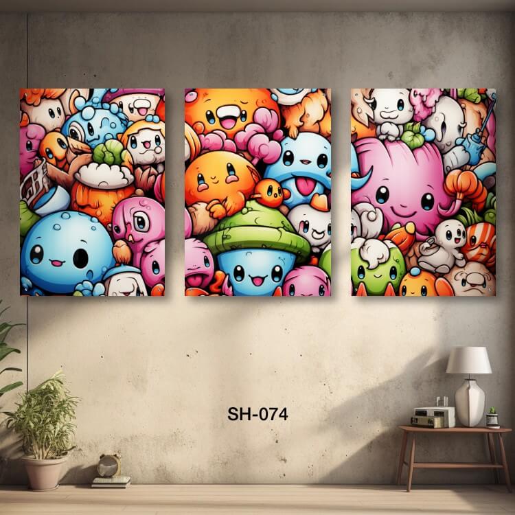 תמונות זכוכית לחדר שינה – SH-074. שלוש תמונות על זכוכית של בובות צבעוניות מחייכות. מתאים גם לעיצוב הבית בצורה יוקרתית וייחודית. זכוכית מחוסמת 6מ"מ הדפסה על זכוכית בטכנולוגיה UV חדשנית.