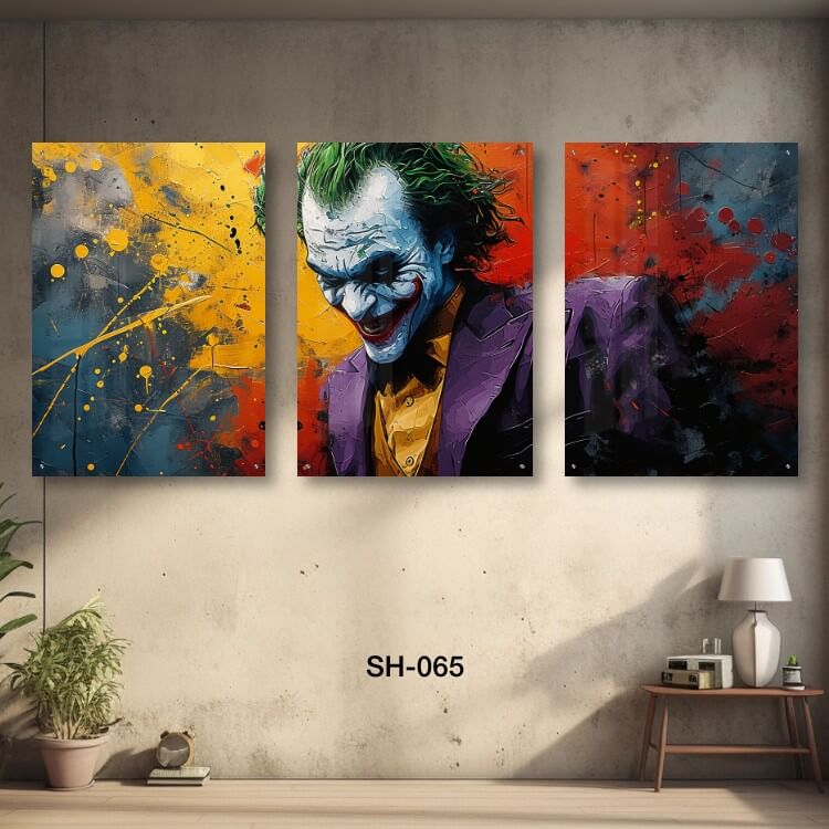 תמונות זכוכית לחדר שינה – SH-065. שלוש תמונות על זכוכית של הג'וקר על רקע כתמי צבע בסגנון פופ ארט. מתאים גם לעיצוב הבית בצורה יוקרתית וייחודית. זכוכית מחוסמת 6מ"מ הדפסה על זכוכית בטכנולוגיה UV חדשנית.