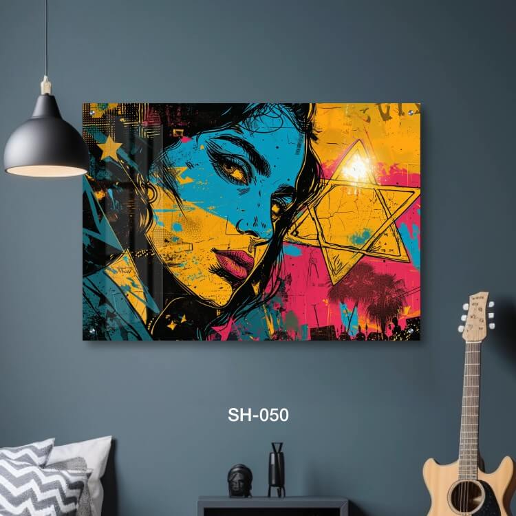 תמונת זכוכית לסלון של אישה צבעונית מצוירת ומגן דוד. SH-050. תמונה על זכוכית יפה של אישה מצוירת בשני צבעים חצויים ומגן דוד. מתאים גם לעיצוב הבית בצורה יוקרתית וייחודית. זכוכית מחוסמת 6מ"מ הדפסה על זכוכית בטכנולוגיה UV חדשנית.