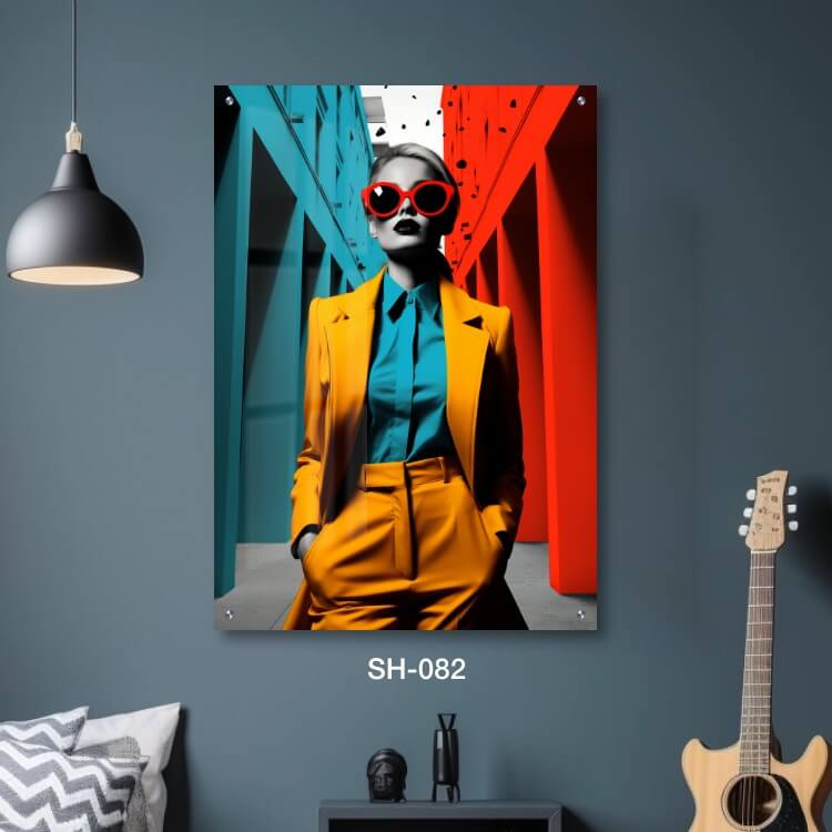 תמונת זכוכית לחדר שינה – SH-082. תמונה על זכוכית מגניבה ויפה של אישה לבושה בצהוב כחול עומד בים שני בניינים אדומים וכחולים. מתאים גם לעיצוב הבית בצורה יוקרתית וייחודית. זכוכית מחוסמת 6מ"מ הדפסה על זכוכית בטכנולוגיה UV חדשנית.