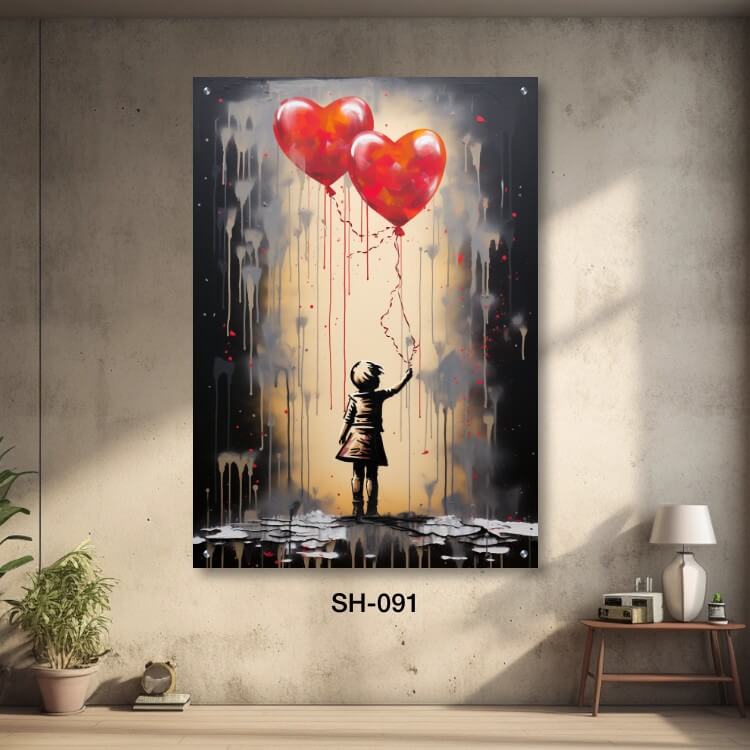תמונת זכוכית לחדר שינה – SH-091. תמונה על זכוכית מגניבה ויפה של ילדה עומד ומחזיקה שני בלונים בצורת לב בסגנון מצויר. מתאים גם לעיצוב הבית בצורה יוקרתית וייחודית. זכוכית מחוסמת 6מ"מ הדפסה על זכוכית בטכנולוגיה UV חדשנית.