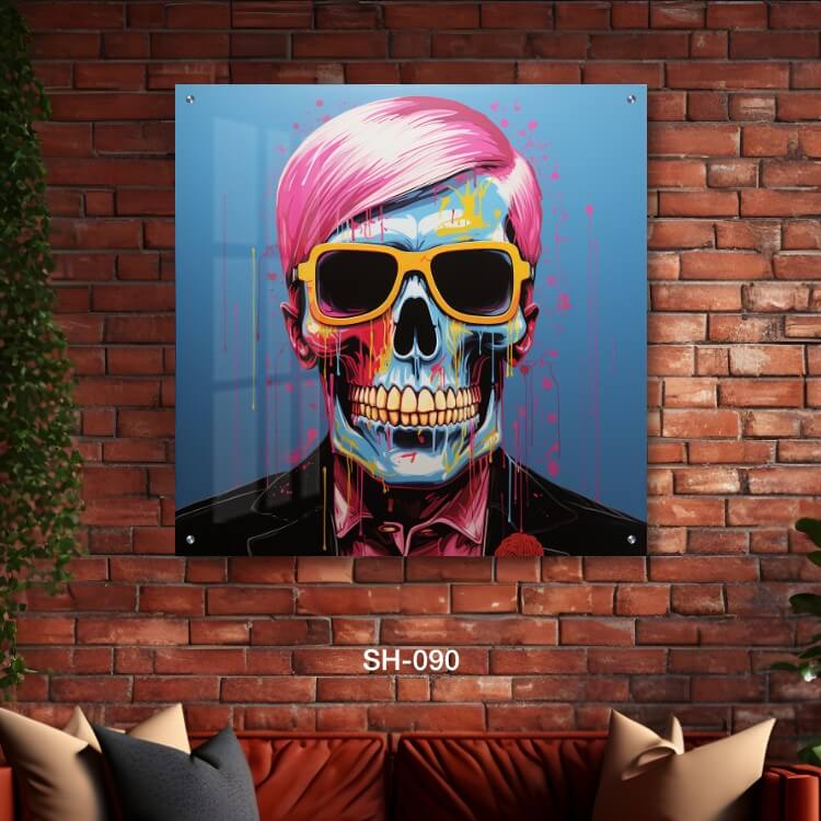 תמונת זכוכית לסלון – SH-090. תמונה על זכוכית יפה של גולגולת לובש בחליפה ומשקפיים עם שיער סגול ורקע כחול. מתאים גם לעיצוב הבית בצורה יוקרתית וייחודית. זכוכית מחוסמת 6מ"מ הדפסה על זכוכית בטכנולוגיה UV חדשנית.