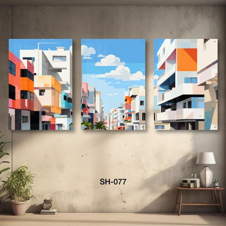 שלישיית תמונות זכוכית לסלון של בניינים. SH-073. שלוש תמונות על זכוכית של נוף בניינים גבוהים. מתאים גם לעיצוב הבית בצורה יוקרתית וייחודית. זכוכית מחוסמת 6מ"מ הדפסה על זכוכית בטכנולוגיה UV חדשנית.