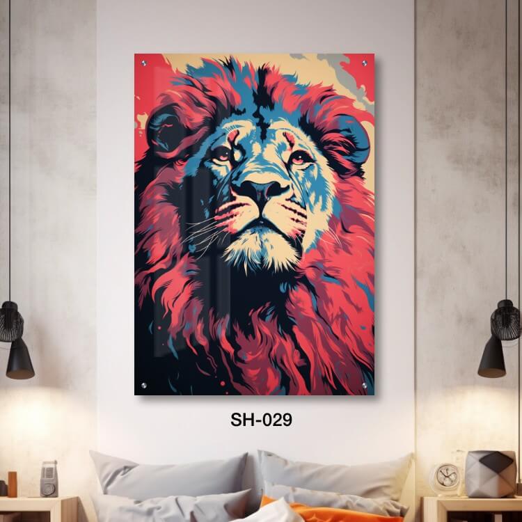 תמונת זכוכית לחדר שינה – SH-029. תמונה על זכוכית יפה של אריה צבעוני מצויר. מתאים גם לעיצוב הבית בצורה יוקרתית וייחודית. זכוכית מחוסמת 6מ"מ הדפסה על זכוכית בטכנולוגיה UV חדשנית.