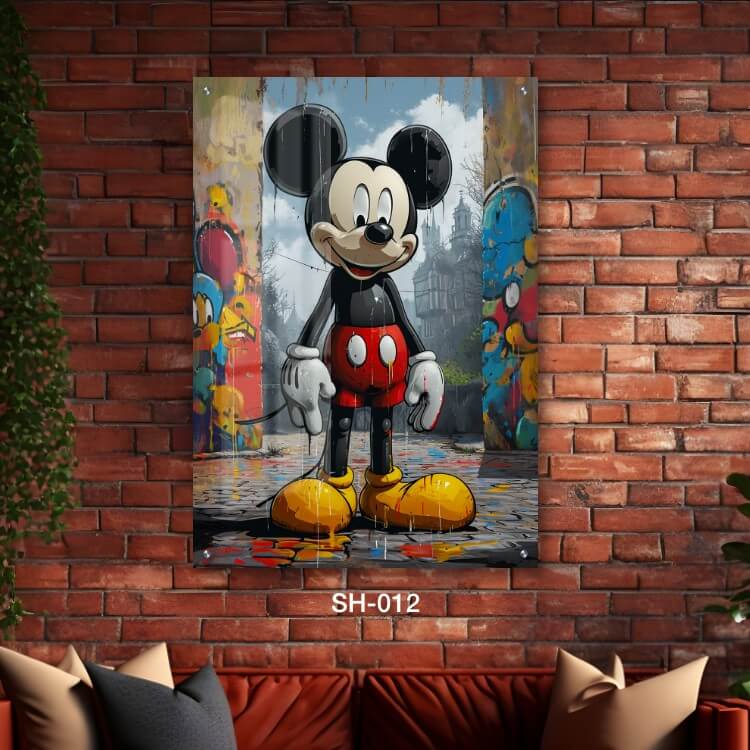 תמונת זכוכית לסלון – SH-012. תמונה על זכוכית יפה של מיקי מאוס עומד ברחוב וקירות גרפיטי מאחורה. מתאים גם לעיצוב הבית בצורה יוקרתית וייחודית. זכוכית מחוסמת 6מ"מ הדפסה על זכוכית בטכנולוגיה UV חדשנית.